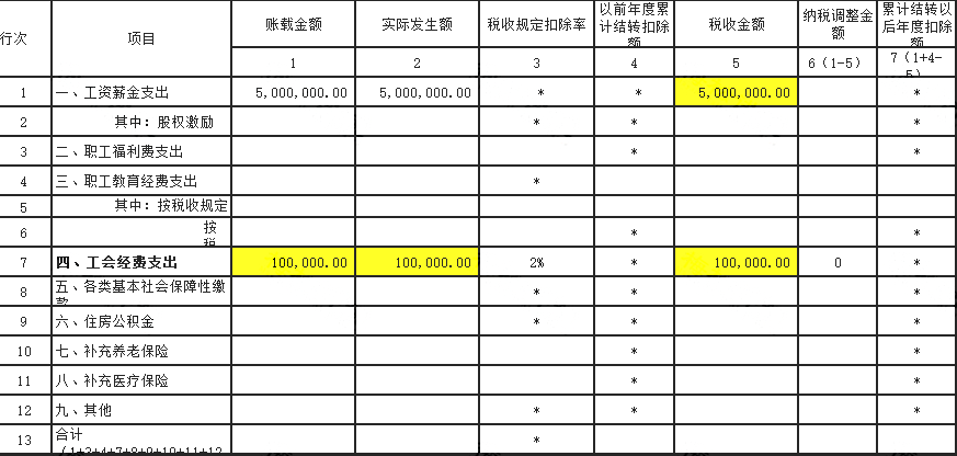 2、实际发生额分析填报纳税人“应付职工薪酬”会计科目下的工会经费本年实际发生额,公司10万全额拨付给工会,所以,这里的实际发生额应该填写10万。