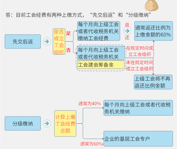 1、建立工会组织的单位,先按每月全部职工工资薪金总额的2%计算出工会经费全额向工会组织拨缴,或者向受委托代收工会经费的税务机关缴纳。上级工会组再按规定比例「一般为60%」转拨给缴费企业基层工会。2、未建立工会组织的单位,按每月全部职工工资薪金总额的2%计算出工会建会筹备金全额向上级工会组织拨缴,或者向受委托代收工会经费的税务机关缴纳。在规定时间内成立工会组织的上级工会再按规定比例「一般为60%」转拨给缴费企业基层工会,在规定时间内未成立工会组织的,以前缴纳的工会建会筹备金不再返还。如果你向税务局申报的是按照工资总额2%计算的工会经费,那就是这种方式。按每月全部职工工资薪金总额的2%计算出工会经费后,按当地规定比例「一般为40%」向受委托代收工会经费的税务机关缴纳。留成部分「一般为60%」由企业同时拨付给其所在的基层工会,未设立基层工会的,待建立工会组织后由各单位拨付本单位工会。工会经费拨付给工会后,工会单独设账核算。如果你向税务申报的是按照工资总额0.8%「2%*40%」计算的工会经费,那就是这种方式。小微企业享受2022年工会经费全额返还的,依据2021年认定数据。参照工业和信息化部、国家统计局、发展改革委、财政部发布的《中小企业划型标准规定》,具体如下表所示。