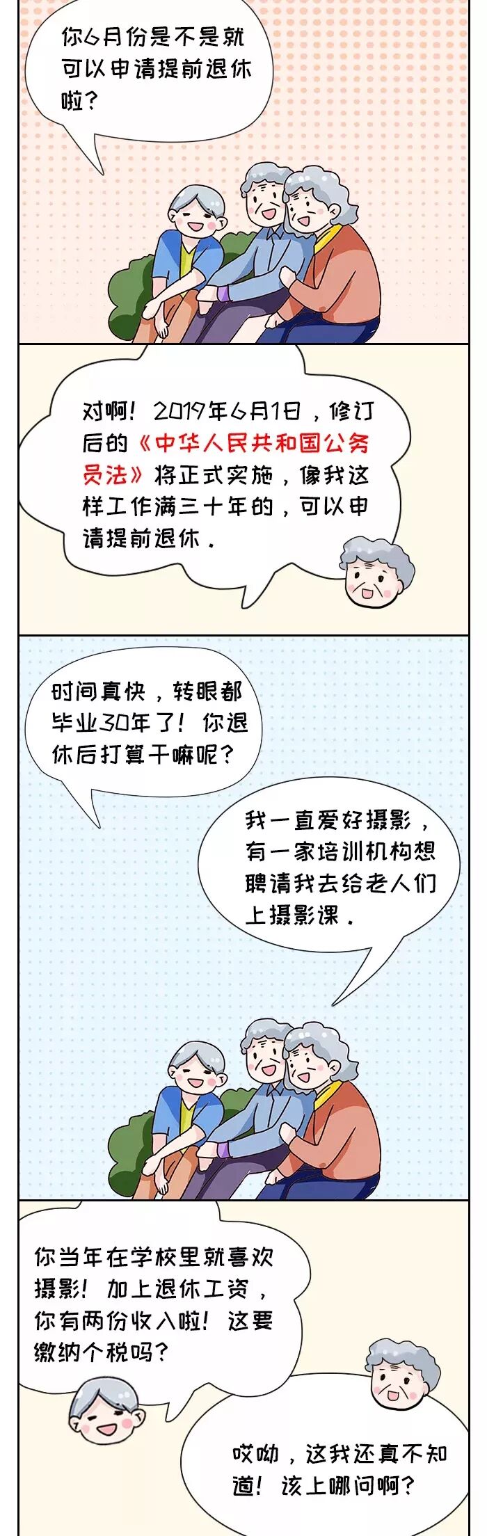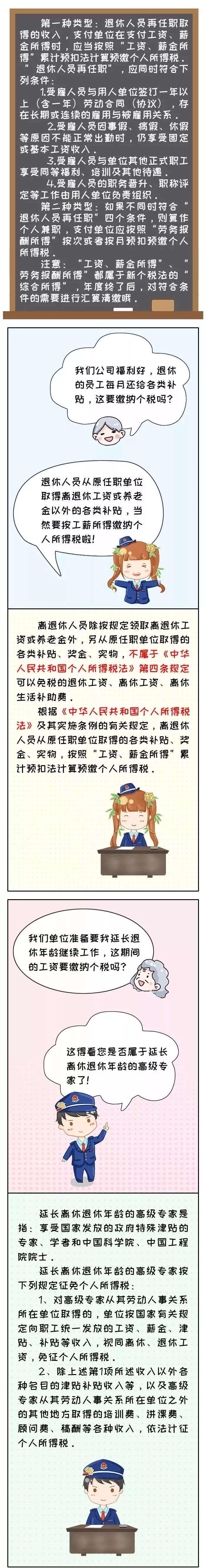 《中华人民共和国个人所得税法》第四条第七款规定:按照国家统一规定发给干部、职工的安家费、退职费、基本养老金或者退休费、离休费、离休生活补助费免征个人所得税。需要提醒的是,退休人员如还取得返聘工资,不需要合并退休工资、离休工资和离休生活补助费计算缴纳个税;退休人员取得退休工资、离休工资和离休生活补助费不需要汇总到综合所得计算缴纳个税。2.离退休人员从原任职单位取得离退休工资或养老金以外的各类补贴应按工薪所得缴纳个人所得税《国家税务总局关于离退休人员取得单位发放离退休工资以外奖金补贴征收个人所得税的批复》(国税函[2008]723号)规定:离退休人员除按规定领取离退休工资或养老金外,另从原任职单位取得的各类补贴、奖金、实物,不属于《中华人民共和国个人所得税法》第四条规定可以免税的退休费、离休费、离休生活补助费。根据《中华人民共和国个人所得税法》及其实施条例的有关规定,离退休人员从原任职单位取得的各类补贴、奖金、实物,应在减除费用扣除标准后,按“工资、薪金所得”应税项目缴纳个人所得税。通俗的说,原任职单位给离退休人员“发的”各类补贴、奖金、实物,需要按照《国家税务总局关于发布<个人所得税扣缴申报管理办法(试行)>的公告》(税务总局公告2018年第61号)相关规定,按照“工资、薪金所得”预扣预缴个人所得税,离退休人员自行按照综合所得税决定是否需要汇算清缴。《国家税务总局关于个人兼职和退休人员再任职取得收入如何计算征收个人所得税问题的批复》(国税函〔2005〕382号)规定,个人兼职取得的收入应按照“劳务报酬所得”应税项目缴纳个人所得税;退休人员再任职取得的收入,在减除按个人所得税法规定的费用扣除标准后,按“工资、薪金所得”应税项目缴纳个人所得税。《国家税务总局关于个人所得税有关问题的公告》(国家税务总局公告2011年第27号)规定,国税函〔2006〕526号第三条中,单位是否为离退休人员缴纳社会保险费,不再作为离退休人员再任职的界定条件。通俗的说,离退休人员再任职要根据具体情况分析,判断是否按“工资、薪金所得”还是“劳务报酬所得”应税项目缴纳个人所得税。4.退休人员取得工资薪金所得按照综合预扣预缴和汇算清缴缴纳个税 居民个人取得综合所得(工资、薪金所得、劳务报酬所得、稿酬所得、特许权使用费所得),按纳税年度合并计算个人所得税。居民个人的综合所得,以每一纳税年度的收入额减除费用六万元以及专项扣除(包括居民个人按照国家规定的范围和标准缴纳的基本养老保险、基本医疗保险、失业保险等社会保险费和住房公积金等)、专项附加扣除(包括子女教育、继续教育、大病医疗、住房贷款利息或者住房租金、赡养老人等支出)和依法确定的其他扣除后的余额,为应纳税所得额。通俗的说,离退休人员再任职取得工资薪金/劳务报酬,可以按规定预扣预缴/汇算清缴时扣除子女教育、继续教育、大病医疗、住房贷款利息或者住房租金、赡养老人等专项附加扣除支出。5.延长离退休年龄的高级专家从所在单位取得的工资、补贴等视同离退休工资免税《财政部国家税务总局关于高级专家延长离休退休期间取得工资薪金所得有关个人所得税问题的通知》(财税〔2008〕7号)规定:延长离休退休年龄的高级专家是指享受国家发放的政府特殊津贴的专家、学者和中国科学院、中国工程院院士。延长离休退休年龄的高级专家按下列规定征免个人所得税:(1)对高级专家从其劳动人事关系所在单位取得的,单位按国家有关规定向职工统一发放的工资、薪金、奖金、津贴、补贴等收入,视同离休、退休工资,免征个人所得税;(2)除上述1项所述收入以外各种名目的津补贴收入等,以及高级专家从其劳动人事关系所在单位之外的其他地方取得的培训费、讲课费、顾问费、稿酬等各种收入,依法计征个人所得税。6.个人提前退休取得的一次性补贴收入按工资所得计税《财政部、国家税务总局关于个人所得税法修改后有关优惠政策衔接问题的通知》(财税〔2018〕164号)规定:个人办理提前退休手续而取得的一次性补贴收入,应按照办理提前退休手续至法定离退休年龄之间实际年度数平均分摊,确定适用税率和速算扣除数,单独适用综合所得税率表,计算纳税。计算公式:应纳税额={〔(一次性补贴收入÷办理提前退休手续至法定退休年龄的实际年度数)-费用扣除标准〕×适用税率-速算扣除数}×办理提前退休手续至法定退休年龄的实际年度数。 《国家税务总局关于个人所得税有关政策问题的通知》(国税发〔1999〕58号)规定:实行内部退养的个人在其办理内部退养手续后至法定离退休年龄之间从原任职单位取得的工资、薪金,不属于离退休工资,应按“工资、薪金所得”项目计征个人所得税。个人在办理内部退养手续后从原任职单位取得的一次性收入,应按办理内部退养手续后至法定离退休年龄之间的所属月份进行平均,并与领取当月的“工资、薪金”所得合并后减除当月费用扣除标准,以余额为基数确定适用税率,再将当月工资、薪金加上取得的一次性收入,减去费用扣除标准,按适用税率计征个人所得税。个人在办理内部退养手续后至法定离退休年龄之间重新就业取得的“工资、薪金”所得,应与其从原任职单