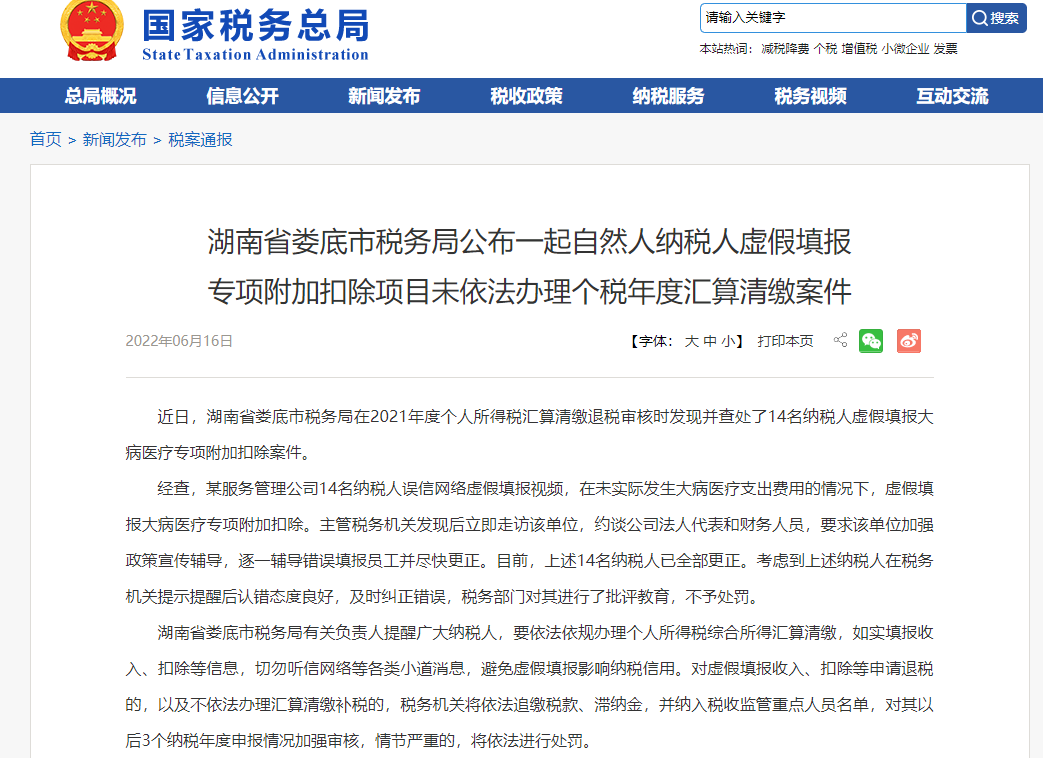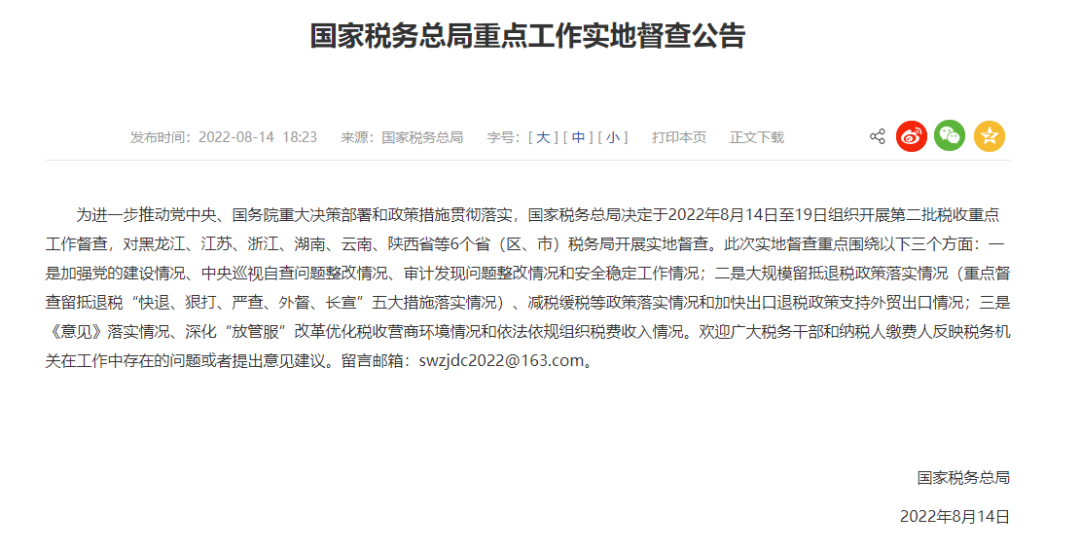 国家税务总局督查公告,涉及黑龙江、江苏、浙江、湖南、云南、陕西......更重磅的是,金税四期+智慧稽查+大数据,2022年最严稽查来了!为进一步推动党中央、国务院重大决策部署和政策措施贯彻落实,国家税务总局决定于2022年8月14日至19日组织开展第二批税收重点工作督查,对黑龙江、江苏、浙江、湖南、云南、陕西省等6个省(区、市)税务局开展实地督查。一是加强党的建设情况、中央巡视自查问题整改情况、审计发现问题整改情况和安全稳定工作情况;二是大规模留抵退税政策落实情况(重点督查留抵退税“快退、狠打、严查、外督、长宣”五大措施落实情况)、减税缓税等政策落实情况和加快出口退税政策支持外贸出口情况;三是《意见》落实情况、深化“放管服”改革优化税收营商环境情况和依法依规组织税费收入情况。6月21日,审计署审计长向十三届全国人大常委会第三十五次会议作了《国务院关于2021年度中央预算执行和其他财政收支的审计工作报告》明确指出:个人所得税征管执法不严问题,涉及20余省,偷逃个税47.22亿元。审计署拥有金融、公安、税务等各方面的数据,也很多涉税违法行为是由审计署最先发现线索并移交给税务机关的!所以说,审计署的报告从某种意义上代表了税务稽查方向!税务总局联合公安部、海关总署、人民银行、最高人民检察院、国家外汇管理局开展打击“假企业”“假出口”“假申报”专项行动。在六部门召开全国打击“三假”虚开骗税违法犯罪专项行动总结暨常态化打击工作部署会议,提出“常打长打”,开展六部门联合常态化打击,进一步保持“严”的态势,强化“打”的震慑,提升“治”的效果。2022年,严打骗取增值税留抵退税,就近一个月来,税务总局连续通报300余起骗取留抵退税案件,可见税务局的稽查力度有多大!除上述外,这八大行业仍是2022年税务局稽查重点:电商行业、建筑行业、外贸行业、劳务派遣行业、医疗美容行业、直播、文娱行业、高新技术企业、高收入人群股权转让等行业和领域。