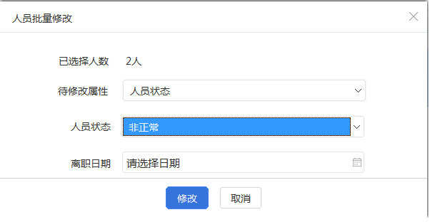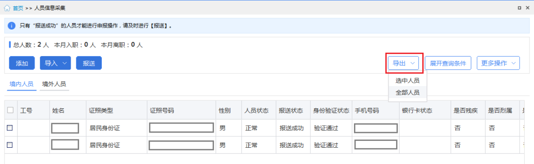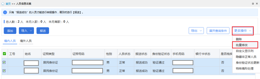 打开人员信息采集,选中要修改的人员,点击“更多操作”—“批量修改”,“待修改属性”中选择“人员状态”,选择“非正常”,录入离职日期,点击修改。 ↓ 打开人员信息采集,点击“导出”—“全部人员”,将导出的excel文件中要修改的人员状态信息改为非正常,填写离职日期后保存,再点击“导入”—“导入文件”,将更新的excel文件重新导入即可。 ↓ ↓ 重新报送人员信息 勾选已修改人员信息,点击“报送”,报送成功后,系统获取反馈,当报送状态为“已报送”,身份状态为“验证通过”即可。