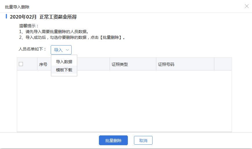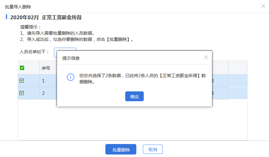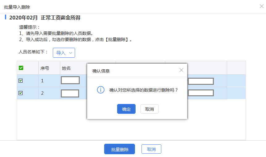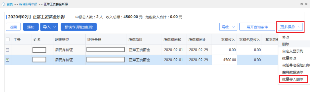 对于“被任职—曾经任职”的申诉,可以在扣缴客户端首页的“待处理事项”或右上角“消息中心”中打开风险提示,核实申诉人情况。 注意!对于其他申诉(如被收入),扣缴单位应主动配合税务机关核实相关情况,区分以下情形处理: 在首页逐月切换所得月份,在申报表报送界面,点击“更正申报”,将“申报状态”修改为“待申报”。 重新进入“收入及减除填写”界面,选择所得项目,进入申报表填写界面,将申诉属实人员收入信息删除。 也可选择批量方式删除↓↓↓ ①在首页逐月切换所得月份,在申报表报送界面,点击“更正申报”,将“申报状态”修改为“待申报”。 ↓ ↓ 删除完收入信息后,再来修改人员任职信息吧。点击“人员信息采集”,选择申诉人员: (1)确认为已离职人员的,在“人员信息”明细页面,填写实际离职日期,并将人员状态修改为“非正常”。 (2)确认为非本单位人员的,在“人员信息”明细页面,填写离职日期,且与任职受雇从业日期保持一致,并将人员状态修改为“非正常”。 完成人员信息更正后,重新进行税款计算并进入申报表报送界面,点击“发送申报”,将申报表进行重新报送并获取反馈。反馈结果显示申报成功即可。 ↓ ↓