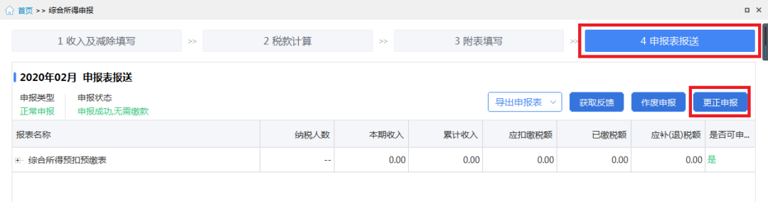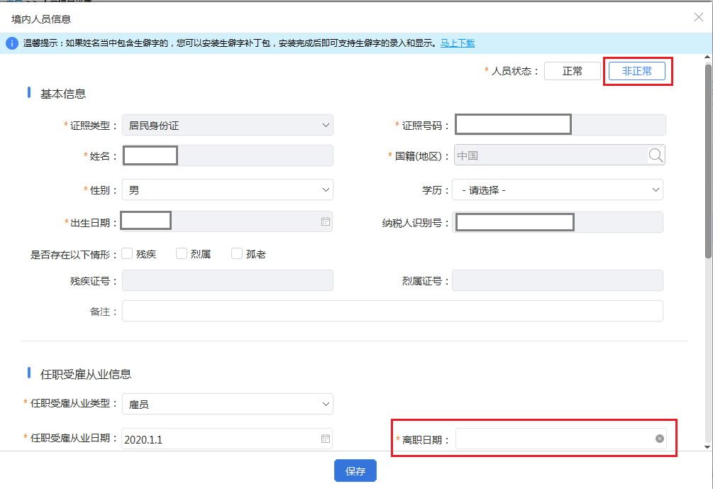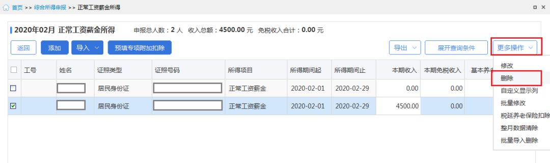 扣缴客户端现在已支持对往期(2019年及之后)的错报、漏报信息进行更正。 01 ① 进入扣缴端,在首页选择需要更正的“税款所属月份”。 ② 进入“综合所得申报”模块,直接进入最后一项“申报表报送”,并点击“更正申报”启动更正。 启动更正时,系统会自动导出一份当前有效的申报记录供纳税人留存备用并提示保存路径(默认为桌面)。 还是在“综合所得申报”模块,进入第一项“收入及减除费用填写”,选择需要删除的人员,勾选相应数据后删除。 完成本期数据的修改后,进入第二项“税款计算”,重新计算更正后的应补(退)税额。进入第四项“申报表报送”进行申报表的重新报送。 划重点 1. 更正往期的申报表之后,需要对该所属期之后至当前已申报的申报表进行同步更正。 2. 扣缴客户端不支持更正往期申报的情况:①新增人员;②修改累计专项附加扣除金额;③曾经在办税服务厅更正过该所属期的申报表;④数据丢失。上述情况需前往办税服务厅办理更正。 二、员工离职、离退后的任职信息处理 修改人员任职信息 登录个人所得税扣缴客户端,打开人员信息采集,点击要修改的人员,打开人员信息,右上角“人员状态”选择“非正常”,填入离职日期,点击保存。 ↓