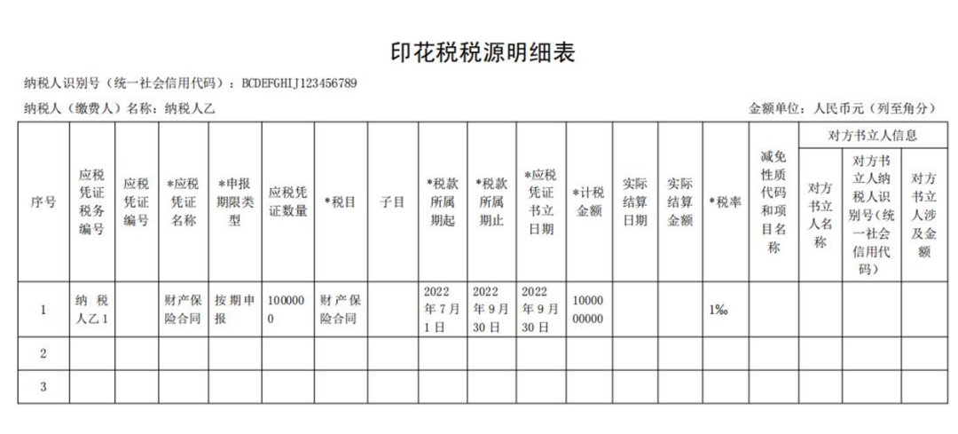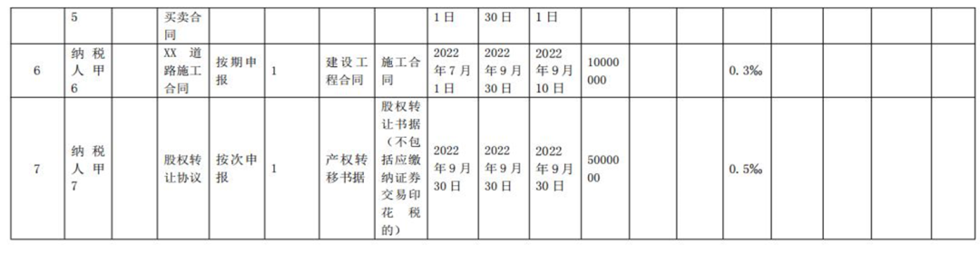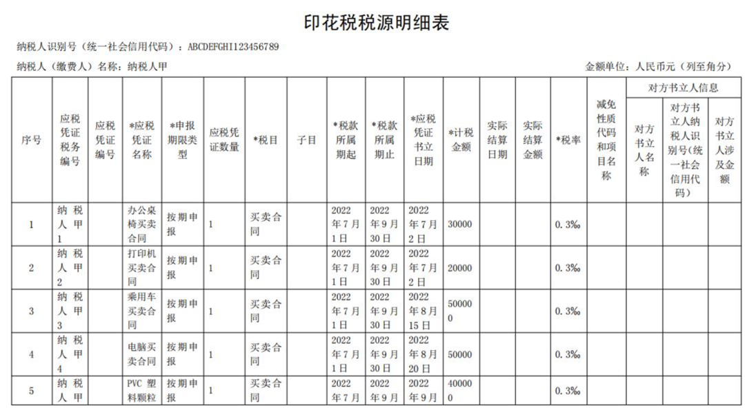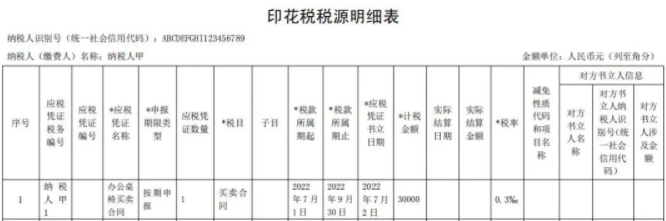 按照印花税规定,第十五条 印花税的纳税义务发生时间为纳税人书立应税凭证或者完成证券交易的当日。所以,此买卖合同7月2日就达到了印花税纳税义务时间,就该交税了。但是我一个大公司,每天都在签订合同,如果签订一个我就要报一次税,那就算不把财务累死,也得把税务局的烦死。所以就有了纳税期限的规定,规定你什么时候为一个周期纳税。不管是以前的按月申报,还是现在的按季申报、按年申报,其实就是纳税期限。比如高小顿公司是按季申报,那么我就是以一个季度为周期计算印花税,7月2日属于第3季度,我可以等到第3季度完了后,一起申报印花税。申报期限、缴纳期限,我按照纳税期限计算了我的税款后,最终得申报缴纳,什么时候申报缴纳,这就是申报期限和缴纳期限。高小顿这个买卖合同是按季申报,那么就应该是季度结束后15日内申报缴纳税款,也就是10月15日之前,当然标准是15日,但是按照征管法规定,申报期会根据国家节假日做调整,具体就是以调整后的为准。纳税人应当根据书立印花税应税合同、产权转移书据和营业账簿情况,填写《印花税税源明细表》,进行财产行为税综合申报。合同数量较多且属于同一税目的,可以合并汇总填写《印花税税源明细表》。纳税人甲按季申报缴纳印花税,2022年第三季度书立买卖合同5份,合同所列价款(不包括列明的增值税税款)共计100万元,书立建筑工程合同1份,合同所列价款(不包括列明的增值税税款)共计1000万元,书立产权转移书据1份,合同所列价款(不包括列明的增值税税款)共计500万元。该纳税人应在书立应税合同、产权转移书据时,填写《印花税税源明细表》,在2022年10月纳税申报期,进行财产行为税综合申报,具体如下:❖纳税人甲2022年10月纳税申报期应缴纳印花税:100万元×0.3‰+1000万元×0.3‰+500万元×0.5‰=5800元纳税人乙按季申报缴纳印花税,2022年第三季度书立财产保险合同100万份,合同所列保险费(不包括列明的增值税税款)共计100000万元。该纳税人应在书立应税合同时,填写《印花税税源明细表》,在2022年10月纳税申报期,进行财产行为税综合申报,具体如下:❖纳税人乙2022年10月纳税申报期应缴纳印花税: