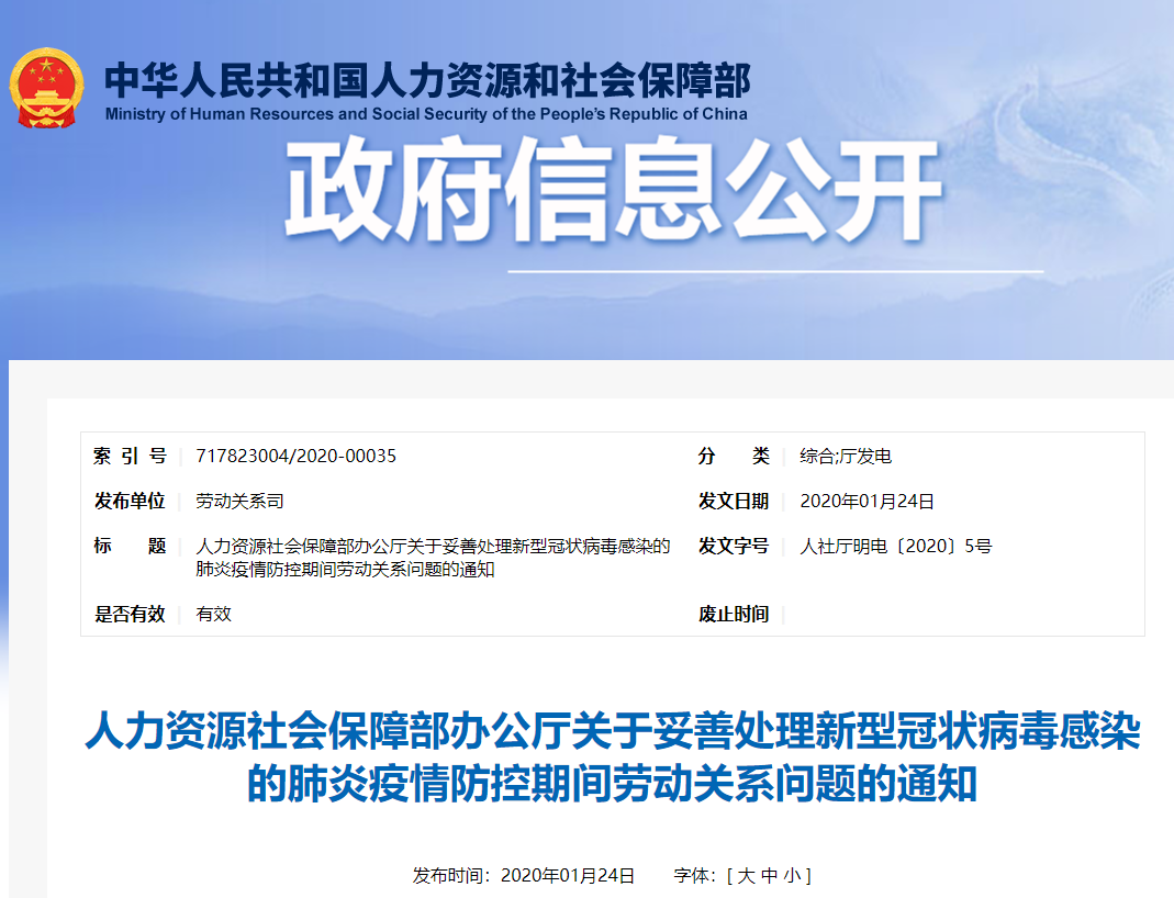 根据《关于妥善处理新型冠状病毒感染的肺炎疫情防控期间劳动关系问题的通知》(人社厅明电〔2020〕5号)第一条规定: