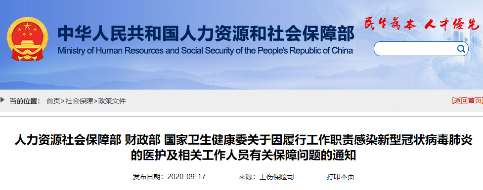 人社部《关于因履行工作职责感染新型冠状病毒肺炎的医护及相关工作人员有关保障问题的通知》中明确规定:
