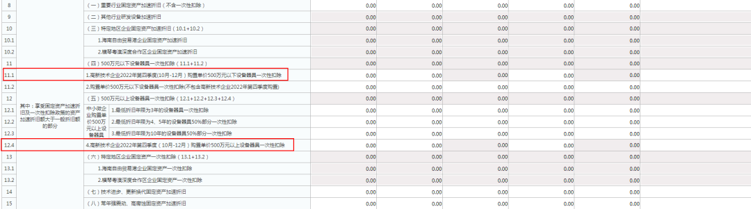 答:根据《财政部 税务总局 科技部关于加大支持科技创新税前扣除力度的公告》(财政部 税务总局 科技部公告2022年第28号)规定,高新技术企业在2022年10月1日至2022年12月31日期间新购置的设备、器具,允许当年一次性全额在计算应纳税所得额时扣除,并允许在税前实行100%加计扣除。 在2022年度汇算清缴申报时,纳税人需根据购置资产的单价选择填报《A105080资产折旧、摊销及纳税调整明细表》,资产单价小于等于500万元的,填报第11.1行次,资产单价大于500万元的填报第12.4行次。