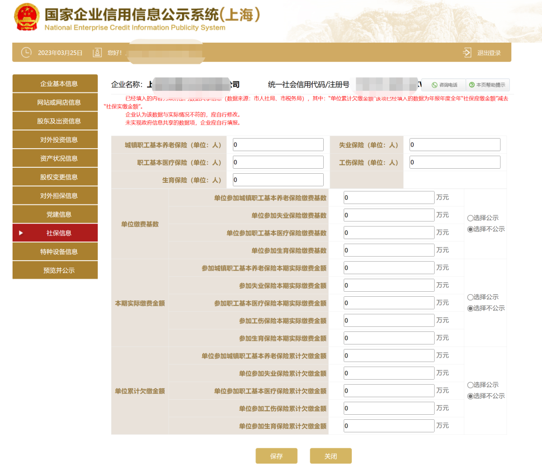 已经填入的数据,为政府部门数据共享信息(数据来源:市人社局、市税务局)。其中:“单位累计欠缴金额”该项已经填入的数据为年报年度全年“社保应缴金额”减去“社保实缴金额”。企业可以根据实际情况,扣除本单位缓缴部分数据后,重新填入“单位累计欠缴金额”