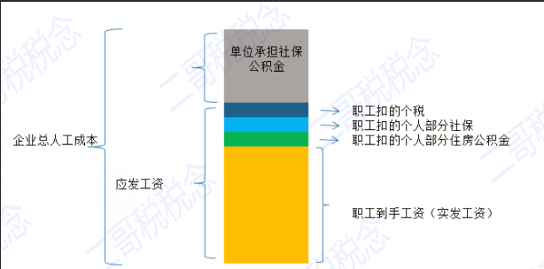 这里的应发合计就是公司承担的职工人工成本中个人的部分,但是这里的应发合计和职工到手的还有差异,因为公司还要帮你代扣代缴个人承担的社保公积金,个人所得税。
