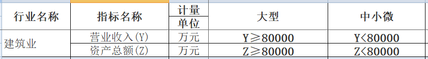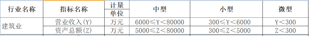 工信部联企业[2011]300号建筑业标准是营业收入80000万元以下或资产总额80000万元以下的为中小微 型企业。其中,营业收入6000万元及以上,且资产总额5000万元及以上的为中型企 业;营业收入300万元及以上,且资产总额300万元及以上的为小型企业;营业收入 300万元以下或资产总额300万元以下的为微型企业。