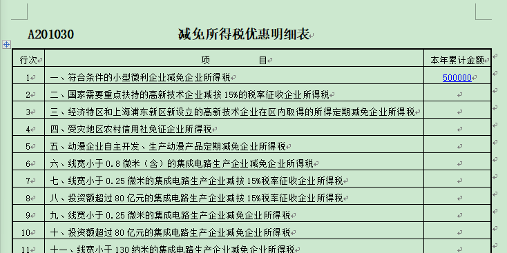 《减免所得税优惠明细表》(A201030)第1行填报享受小型微利企业普惠性所得税减免政策减免企业所得税的金额。