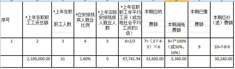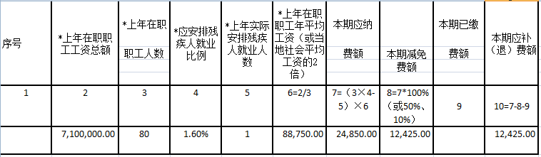 又比如:某公司2020年工资总额710万,职工人数80人,四川省要求的残疾人就业安排比例是1.6%,实际公司安排残疾人1人,安置比例小于1.6%,但是大于1%(实际是1.25%),那实际我们就只按照应纳费额的50%缴纳,相当于减免了50%的费用。