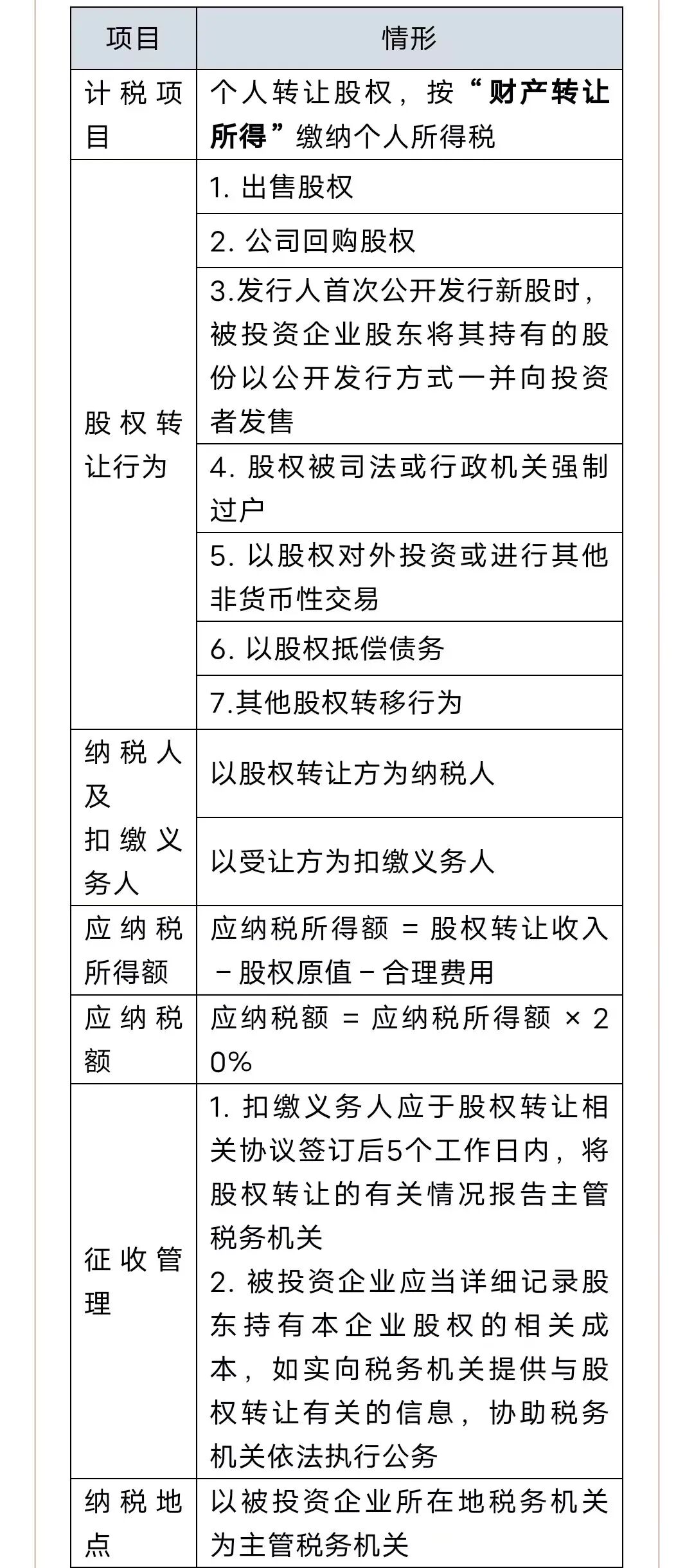 三、警惕!股权转让6大风险点!即日起,一定注意排查! 一、注册资本实缴0元,股东0元转股也是要缴税 对此有人有疑问了,根据规定,应纳税所得额=收入-财产原值-合理费用,我的转股收入是0元,财产原值也是0元,就不用缴纳个税了。 这种想法是错误的,如果股权对应的净资产份额大于0,则对于0元转股,也是需要缴税的。根据国家税务总局公告2014年第67号文规定,申报的股权转让收入明显偏低且无正当理由的,主管税务机关可以核定股权转让收入。 二、解除转让合同并收回股权,已缴纳的个税不退回 股权转让不是儿戏,纳税人一定要正确评估,如果转股不合适,一定要及时止损。 三、股权转让完成,即使未收到转让款,也要缴税 根据《股权转让所得个人所得税管理办法(试行)》规定,只要股权转让完成,即使没有收到转让款项也要缴纳个税,并非是收到转让款才缴税。 四、个人转股过程中收到的违约金,征收个税 根据国税函〔2006〕866号文规定,股权转让后,转让方个人因受让方人未按规定期限支付价款而取得的违约金收入,应按照“财产转让所得”项目计算缴纳个税。 五、个人以股权投资,也应缴纳个税 根据财税〔2015〕41号文规定,个人以非货币资产投资,属于个人转让和投资同时发生,对个人非货币资产转让所得,按“财产转让所得”项目,依法计算缴纳个税。 六、股东撤资应按“股权转让”缴纳个税 根据国家税务总局公告2011年第41号文相关规定,个人因撤资从被投资企业取得的款项,属于个税应税收入,应按“财产转让所得”计缴个税。当然如果取得款项低于股权对应的净资产份额,视为股权转让收入偏低,税务机关有权核定征收。