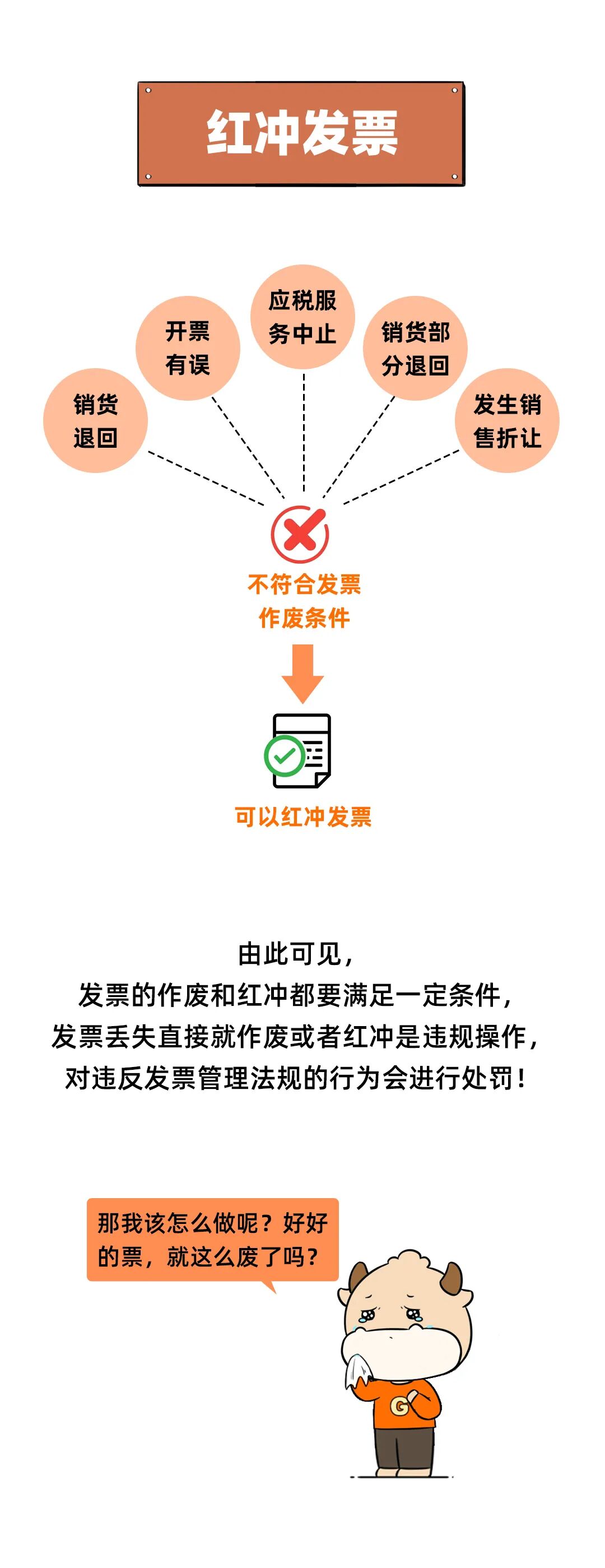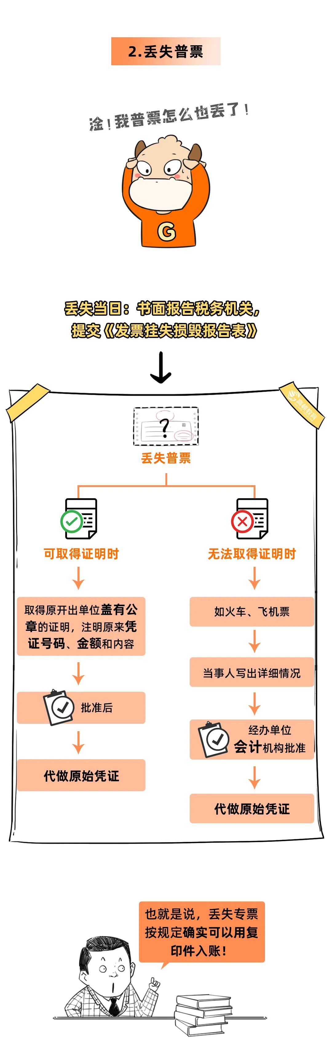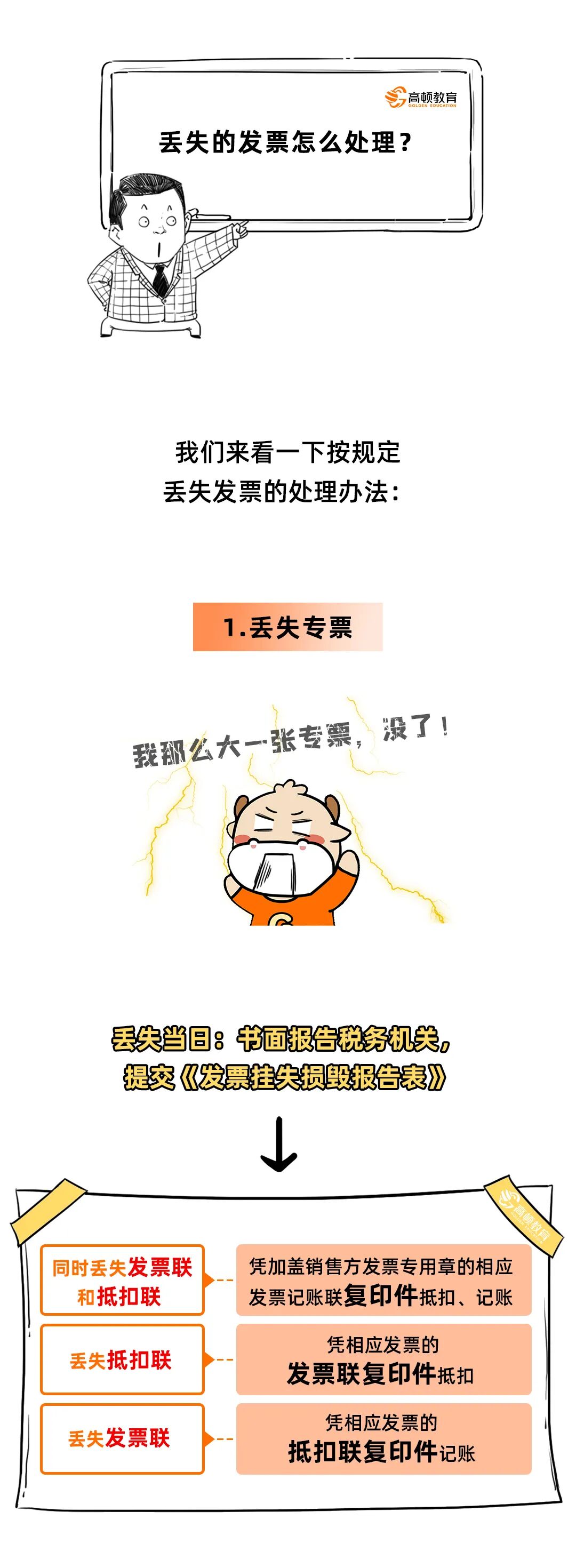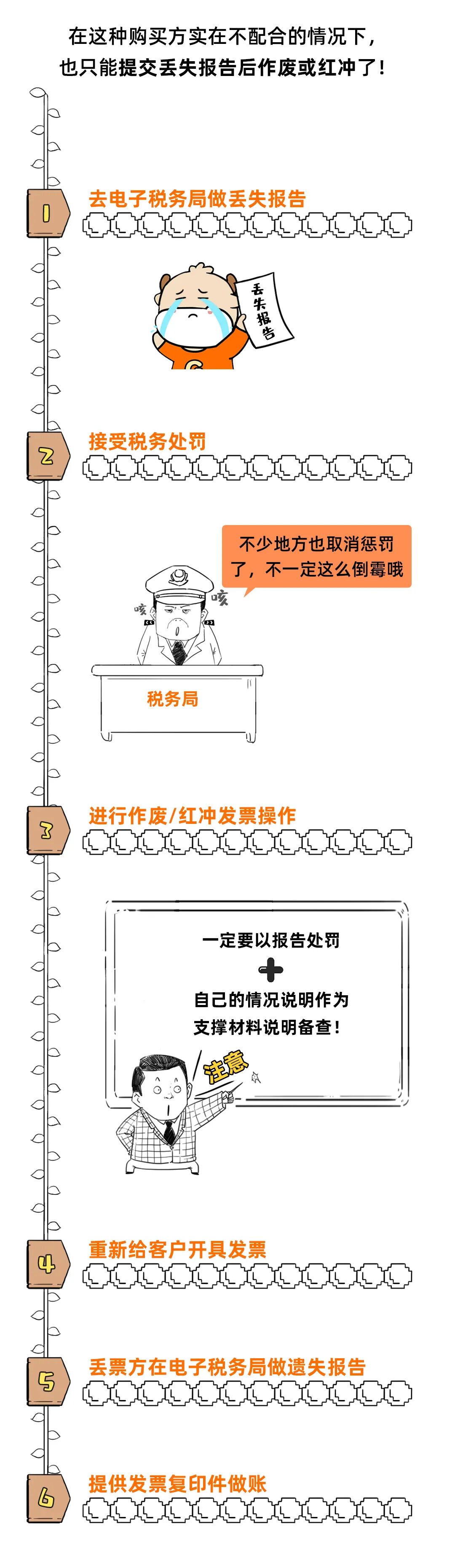 01 发票丢失,具体该怎么办? 最新最全操作指南来了! 不再需要《丢失增值税专用发票已报税证明单》或《丢失货物运输业增值税专用发票已报税证明单》。 关于丢失专用发票记账联如何处理,税法上未作明确的规定。一般情况下,可以凭发票联或抵扣联复印件作为记账凭证,并由提供复印件单位出具相关证明。头条君认为丢失记账联直接从开票系统用A4纸打印入账即可,因为销售方所记的收入,不要少列支就可以。 二、丢失普通发票 丢失普通发票记账联,处理方法与丢失专用发票记账联一致。 三、丢失空白发票(包括专票和普票) 丢失空白发票,应当于发现丢失当日书面报告税务机关,然后填报《发票挂失毁损报告表》,持税控盘到主管税务机关或自行办理电子发票退回或作废手续。 注意:丢失发票不再需要登报申明遗失,也不再需要开具“已报税证明单”,但《发票管理办法实施细则》第三十一条规定,仍需在发现丢失发票当日向当地税务局申报《发票挂失损毁报告》。 02 发票丢失 对方却拒收复印件怎么办? 按照政策规定,丢失发票可以用复印件作为凭证: 但如果对方执意拒收,只能重新开具一份发票。之前丢失的那份要作废或者红冲掉,不然就要多交税。 注意:红冲和作废发票需要一定条件!发票丢失就直接作废或者冲红是违规操作! 1、作废发票 ·未超过销售方开票当月 ·收到退回的发票联、抵扣联 ·销售方未抄税并且未记账 ·购买方未认证,或者认证结果未“纳税人识别号认证不符”、“专票代码、号码认证不符”。 2、红冲发票 当遇到: 销货退回、开票有误、应税服务终止、销货部分退回、发生销售折让等 不符合发票作废条件的,可以红冲发票。 当对方坚持拒收复印件,只能提交丢失报告后作废或红冲,具体流程如下: 1)去电子税务局做丢失报告 2)接受税务处罚(部分地方取消惩罚) 3)进行作废/红冲发票操作(注意一定要以报告处罚和自己的情况说明作为支撑材料说明备查) 4)重新给客户开具发票 5)丢票方在电子税务局做遗失报告 6)提供发票复印件做账 03 发票丢失后果严重 送你3个防丢锦囊! 上面大家已经跟着头条君学习了发票丢失的处理流程,但是会计还是要注意尽量尽量尽量别丢了发票哦!因为丢失的后果是很严重滴,所以防丢办法大家也要学习到。 1、纳税信用评价将被扣分 根据《国家税务总局关于发布<纳税信用评价指标和评价方式(试行)>的公告》(国家税务总局公告2014年第48号)附件《纳税信用评价指标和评价方式(试行)》的规定,未按规定保管纸质发票并造成发票损毁、遗失的,扣3分。 2、最高罚款三万 根据《中华人民共和国发票管理办法》(国务院令第587号)第三十六条规定,丢失发票或者擅自损毁发票的,由税务机关责令改正,可以处1万元以下的罚款;情节严重的,处1万元以上3万元以下的罚款。 3、送你三个防丢锦囊 锦囊一: 财务部门建立《发票管理台账》,规范发票交接手续、流程及追责机制; 锦囊二: 建立发票开具审批流程,并在“发票开具申请单”注明经手人及具体经手时间; 锦囊三: 合同条款中约定接收发票人。 04