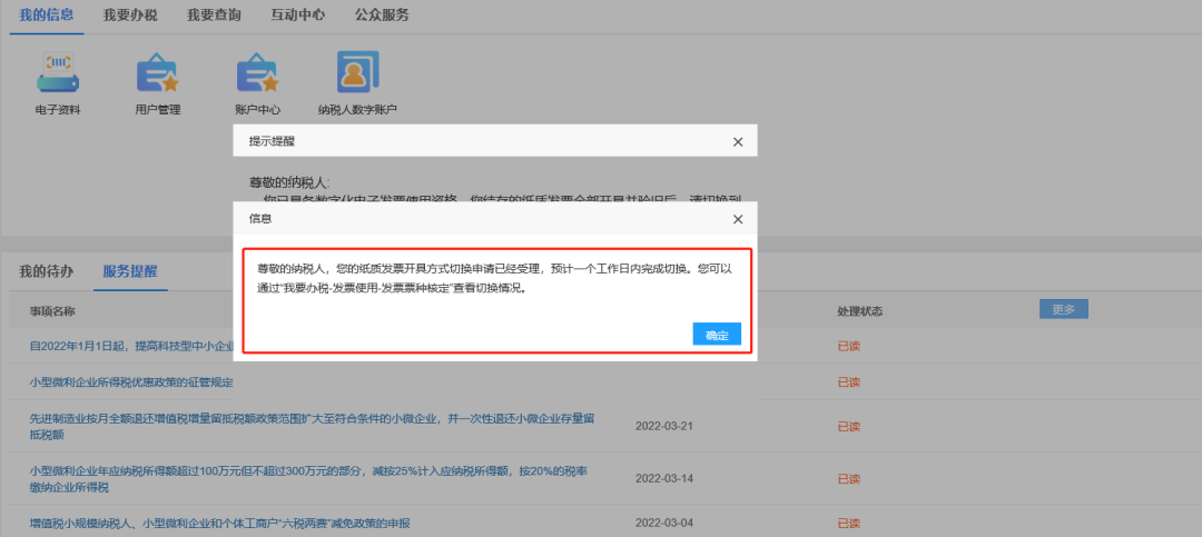 一般来说,纳税人登录电子税务局后,税务局会自动弹窗提示:1.如果纳税人税控纸质发票结存为0,登录电子税务局后弹出以下提示:“尊敬的纳税人,您已具备数字化电子发票使用资格,您结存的纸质发票全部开具并验旧后,将切换到电子税务局开具纸质发票。如有疑问请咨询当地税务机关、12366热线。”同时页面下方增加“确认切换”的按钮,具体界面如下:“尊敬的纳税人,您的纸质发票开具方式切换申请已经受理,预计一个工作日内完成切换。”纳税人一个工作日后,可以登录电子税务局,在“我要办税-发票使用-发票票种核定”栏目查看发票开具方式相关内容。2.如果纳税人纸质税控发票结存不为0,弹出以下提示:“尊敬的纳税人,您已具备数字化电子发票使用资格,您结存的纸质发票全部开具并验旧后,将切换到电子税务局开具纸质发票。如您结存的纸质发票全部开具仍显示此项提示,请先办理发票验旧(增加功能链接)后进行申请开具方式切换。如果您尚有空白发票未开具,请及时开具并验旧完成后申请开具方式切换。如有疑问请咨询当地税务机关、12366热线。同时页面下方增加“发票验旧”的按钮。”如果纳税人点击“发票验旧”后,系统将跳转至电局相应页面。如纳税人对于提醒信息直接点击“×”关闭,则纳税人可以继续办理其他业务,待下次重新登录时,继续按上述规则弹出提示信息。完成开票方式转换后,重新登录电子税务局,【我要办税】——【开票业务】。点击选择【蓝字发票开具】,出现【纸质发票业务】后,就可以利用电子税务局进行开票了。