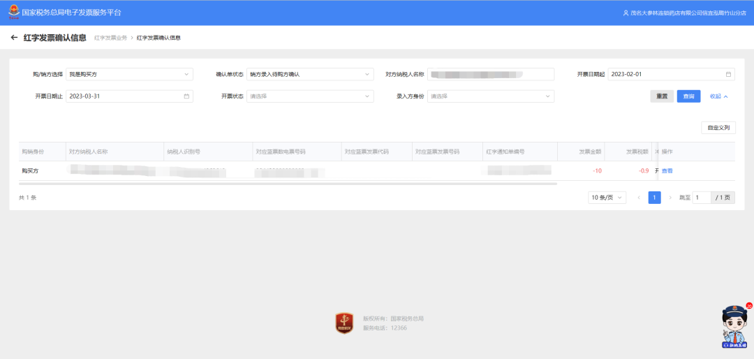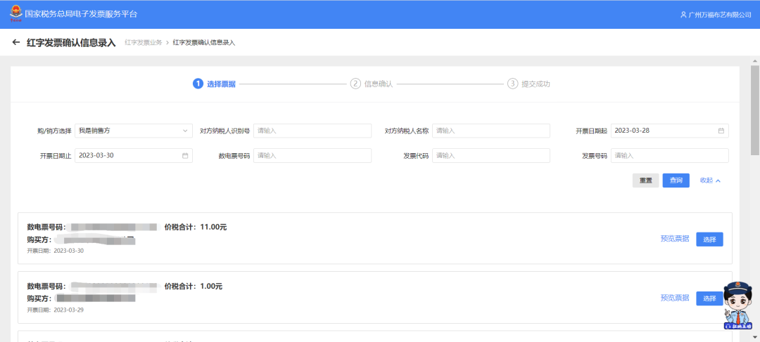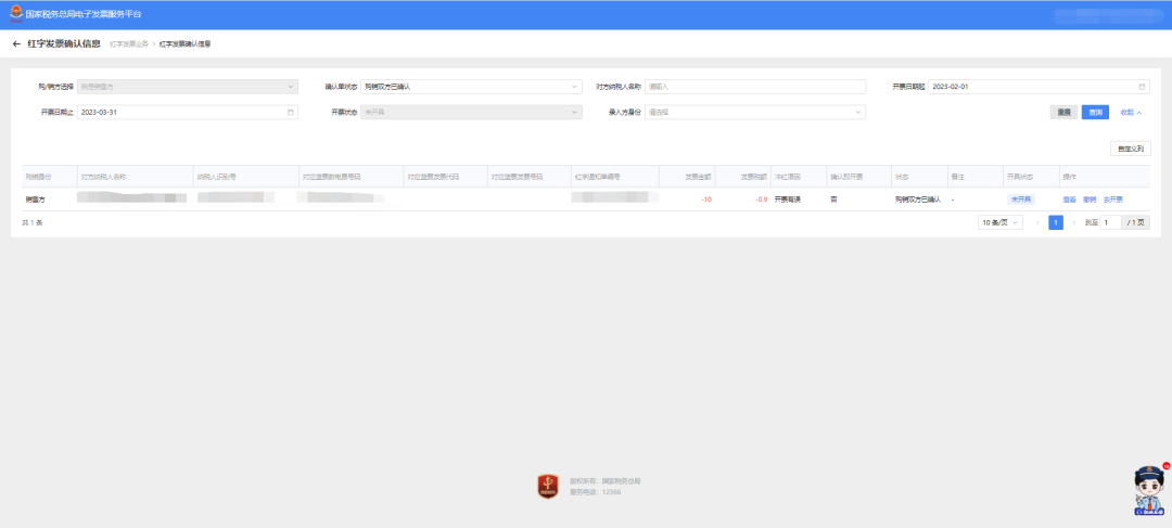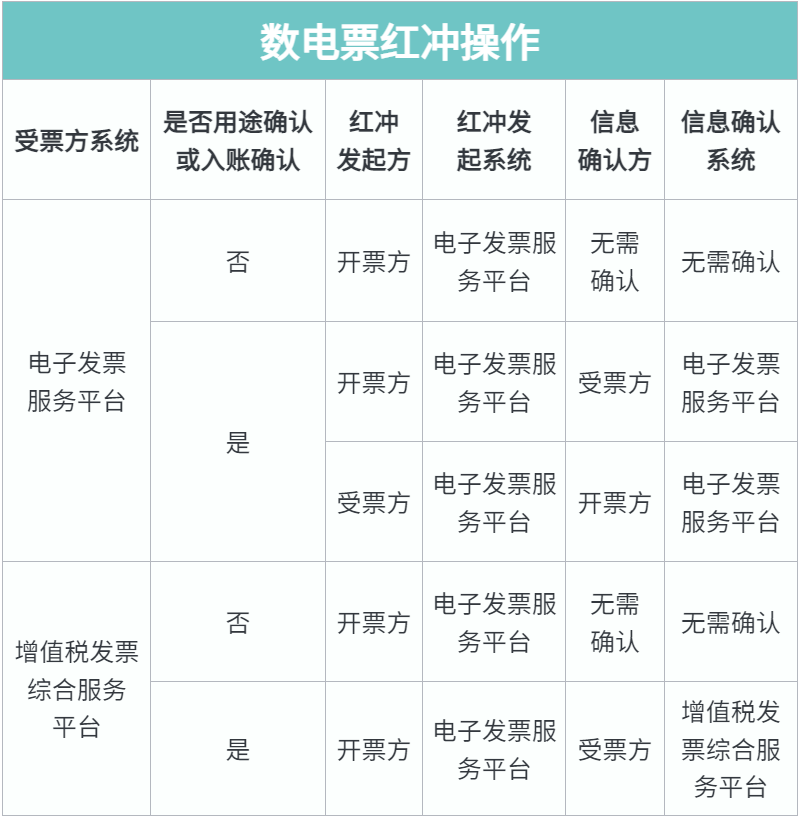 (一)开票方开具数电票后,受票方未做用途确认及入账确认的,开票方在电子发票服务平台填开《红字发票信息确认单》后全额开具红字数电票,无需受票方确认。1.功能菜单依次选择【开票业务】-【红字发票开具】;在搜索栏输入【红字发票开具】,可快速查找【红字发票开具】。或者可通过选择【税务数字账户】-【红字信息确认单】进入红字开具模块。2.纳税人在主页面-常用功能模块点击“红字发票确认信息录入”,进入新增红字发票确认信息界面。4. 在页面点击“选择”,将选中的蓝字发票信息自动带入到页面。1.受票方使用电子发票服务平台,开票方或受票方均可在电子发票服务平台填开并上传《红字发票信息确认单》,经对方在电子发票服务平台确认后,开票方才可全额或部分开具红字数电票。确认操作如下:(1)纳税人登录后需在主页面(红字发票开具初始化页面)点击“红字发票确认信息处理”。2.受票方继续使用增值税发票综合服务平台,由开票方在电子发票服务平台填开并上传《确认单》,经受票方在增值税发票综合服务平台确认后,开票方全额或部分开具红字数电票或红字纸质发票。(1)在菜单中依次选择【发票管理】—【红字申请确认】,进入如下界面。(2)选择“待确认”,根据发票信息输入发票号码和销方识别号,点击【查询】。6.在弹出窗口中查看红字发票信息确认单的数据是否正确,向下滑动竖型条,进入界面。1.当红字确认单状态是购销双方已确认状态或者无需确认状态时,开票方在主页面(红字发票开具页面)-常用功能模块中点击“红字发票开具”。现在大家对数电票的红冲流程有了一些了解了吧~下面这张表格也可以辅助大家记忆哦~1.试点纳税人在电子税务局刚开具了一张蓝字发票,点击【开具红字发票】模块为什么没有信息?试点纳税人开具蓝字发票后,如果需要开具红字发票,需登录电子税务局,在【我要办税】-【开票业务】-【红字发票开具】或者在【我要办税】-【税务数字账户】-【红字信息确认单】模块,点击【红字发票信息表录入】,选择需要红冲的发票确认信息后点击提交,如果无须对方确认即可点击【去开红字发票】开具红字发票,如需对方确认,需要对方进行确认后再行开具红字发票。2.为什么我发起红字发票信息确认流程后无法在【红字发票开具模块】开具红字发票?红字发票信息确认单状态需为购销双方已确认状态或无需确认状态才可直接开具,否则需要确认红字发票信息单后再行开具;收购类发票抵扣勾选后发起红字信息无需对方确认,可以直接开具红字发票。3.我企业是数字化电子发票试点企业,已经开具过数字化电子发票,现在要进行红冲,为什么现在登录电子税务局找不到开票业务这个模块了?试点纳税人登录电子税务局时确认选择的人员权限是否是开票员或者法人及财务负责人,如果选择的办税员登录的话是没有开票业务这个模块的,建议切换至开票员、法人或者财务负责人进行操作。4.我在电子税务局开具红字发票时为什么只能全额开具红字发票?受票方未进行用途确认时,由开票方通过电子税务局发起《红字信息确认单》后全额开具红字数字化电子发票,无需受票方确认;如果受票方已进行用途确认,购销双方任意一方可在电子税务局(当受票方为非试点纳税人时,在增值税发票综合服务平台发起和确认)发起《红字信息确认单》,经对方确认后可以选择全额或部分开具红字数字化电子发票。5.我是试点纳税人,在增值税发票管理系统中已开具红字信息表但还未开具红字发票,是否可以在电子税务局中直接开具? 不可以。红字信息表和红字确认单未实现互相转换,对校验通过的红字信息表仍需通过增值税发票管理系统开具红字发票。6.我是试点纳税人,通过电子税务局接收的数字化电子发票有错误且未抵扣勾选,是否可以开具红字发票?可以,但只能由开票方发起开具红字发票的流程,开具红字发票的原因选择“开票有误”。7.我可以在电子税务局查看增值税发票管理系统开具的红字信息表吗?纳税人需登录电子税务局,在【我要办税】-【开票业务】-【红字发票开具】模块下,下拉页面在“红字发票确认单信息”里的“我发出的信息表”模块查看,需下载和撤销请在增值税发票管理系统操作。