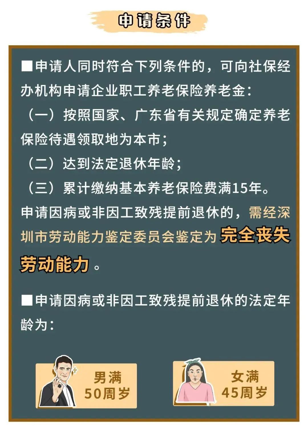 按照原国家劳动社会保障部《关于制止和纠正违反国家规定办理企业职工提前退休有关问题的通知》即劳社部发〔1999〕8号文件规定的精神,工人要办理提前退休,必须要符合这几种条件:一是具有特殊工种工作年限,而且特殊工种工作年限达到国家规定的工作年限,男性达到55周岁,女性达到45周岁二是因病或非因工致残,由医院证明并经劳动鉴定委员会确认完全丧失劳动能力的,男年满50周岁、女年满45周岁;三是国务院确定的111个"优化资本结构"试点城市的国有破产工业企业中距法定退休年龄不足5年的职工;三年内有压锭任务的国有纺织企业中,符合规定条件的纺纱、织布工种的挡车工。⚠️第三项条件有一定的时限性,是特定年代的特殊规定,而且符合这个条件提前办理退休的人员已经执行完毕。以广东省为例,给大家详细讲讲特殊工种和病退两类提前退休的要求: