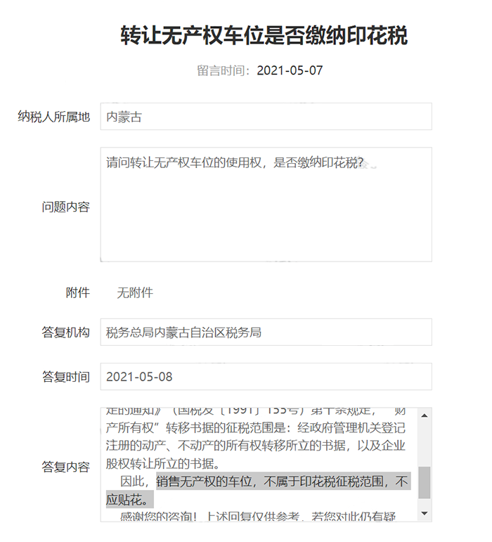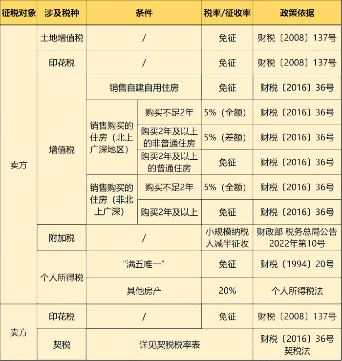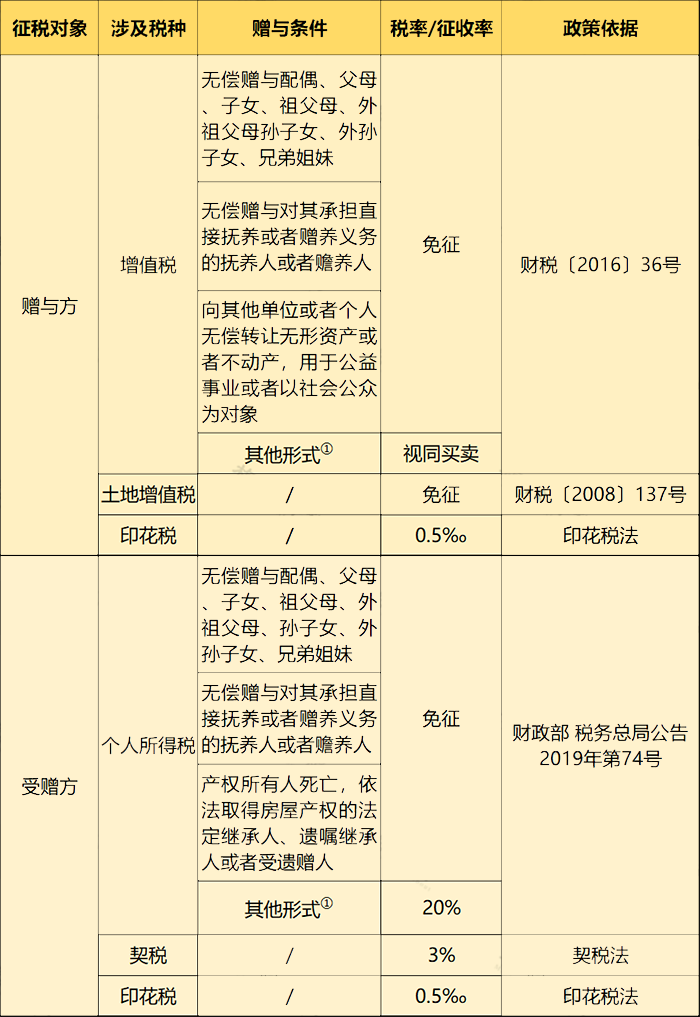 车位属于固定资产 还是无形资产? 税局回复: “根据《中华人民共和国企业所得税法实施条例》(中华人民共和国国务院令第512号)规定: 第五十七条 企业所得税法第十一条所称固定资产,是指企业为生产产品、提供劳务、出租或者经营管理而持有的、使用时间超过12个月的非货币性资产,包括房屋、建筑物、机器、机械、运输工具以及其他与生产经营活动有关的设备、器具、工具等。 第六十五条 企业所得税法第十二条所称无形资产,是指企业为生产产品、提供劳务、出租或者经营管理而持有的、没有实物形态的非货币性长期资产,包括专利权、商标权、著作权、土地使用权、非专利技术、商誉等。” 给大家总结一下: 1、购买的车位,支付的外购价款通常是对土地使用权与建筑物难以合理分配的,因此应当全部作为固定资产。 2、如果企业购买车位的目的,是用于赚取租金或资本增值的,应当将其转为“投资性房地产”,或者直接在购买时就确认为“投资性房地产”。 3、如果是通过以租代售协议取得的,比如租赁期限20年的,按照“实质重于形式原则”,并不影响上述的会计处理。如果非要按照租赁处理,会计核算可以计入“使用权资产”。 最后,再说明一点,有无产权证书,并不影响会计核算对资产的确认,因为基本会计准则、固定资产准则等都重点是要求“拥有或者控制的、预期会给企业带来经济利益”。 如果是无产权车位 相关的税务问题有哪些? 1、对外出租(永久出租)无产权车位要交哪些税? 2、转让无产权车位是否缴纳印花税? 不属于印花税的征税范围,不需要交。 3、购进无产权车位是否需要缴纳房产税? 如果合同属于是长期租赁车位的使用权,那么房产税由出租人缴纳,承租人不缴纳房产税。 无房产证的房屋 是否属于“固定资产”? 资产的确认重点在“拥有或控制”,同时未来可能由经济利益流入;对于固定资产的确认,根本就没有提及产权证书的问题。 有无房产证不影响房屋确认为固定资产。没有房产证的房屋,只要满足规定的条件,不但在会计上可以确认固定资产,而且在税务方面也可以确认为固定资产,然后还可以规定计提折旧并税前扣除。 政策依据: 一、《企业会计准则第4号——固定资产》对于固定资产确认,有如下规定: 第三条 固定资产,是指同时具有下列特征的有形资产: (一)为生产商品、提供劳务、出租或经营管理而持有的; (二)使用寿命超过一个会计年度。 使用寿命,是指企业使用固定资产的预计期间,或者该固定资产所能生产产品或提供劳务的数量 第四条 固定资产同时满足下列条件的,才能予以确认: (一)与该固定资产有关的经济利益很可能流入企业; (二)该固定资产的成本能够可靠地计量。 二、依照《企业会计准则——基本准则(2014)》关于资产确认,规定如下: 第二十条 资产是指企业过去的交易或者事项形成的、由企业拥有或者控制的、预期会给企业带来经济利益的资源。 前款所指的企业过去的交易或者事项包括购买、生产、建造行为或其他交易或者事项。预期在未来发生的交易或者事项不形成资产。 由企业拥有或者控制,是指企业享有某项资源的所有权,或者虽然不享有某项资源的所有权,但该资源能被企业所控制。 预期会给企业带来经济利益,是指直接或者间接导致现金和现金等价物流入企业的潜力。 收藏! 房屋出租、买卖涉及的税费全总结! 一、房屋买卖(含买卖、赠与、继承) 1、房屋买卖 注①:小规模纳税人附加税减半征收政策截至2024年12月31日。 注②:“满五唯一”指自用5年以上、并且是家庭唯一生活用房。 附:契税税率表 2、房屋赠与 注①:无转让价格的,由税务机关核定。 3、房屋继承 二、房屋出租