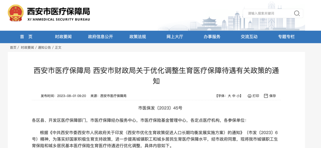 西安市医疗保障局联合西安市财政局发布《关于优化调整生育医疗保障待遇有关政策的通知》,明确从2023年8月1日起,调整城镇职工生育保险待遇。