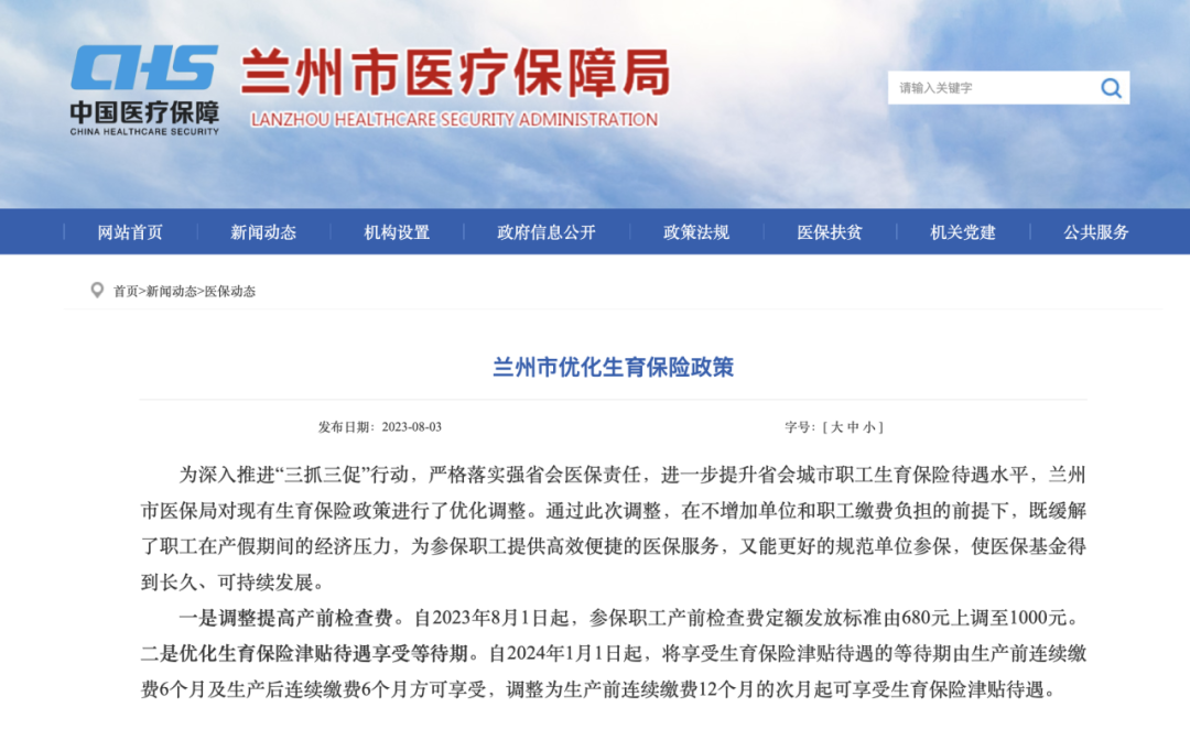 兰州市医疗保障局发布《兰州市优化生育保险政策》,明确自8月1日起,参保职工产前检查费定额标准由680元上调至1000元。