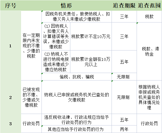 根据规定,纳税人存在偷税、抗税、骗税情形的,是会无限期追查的!具体看表:
