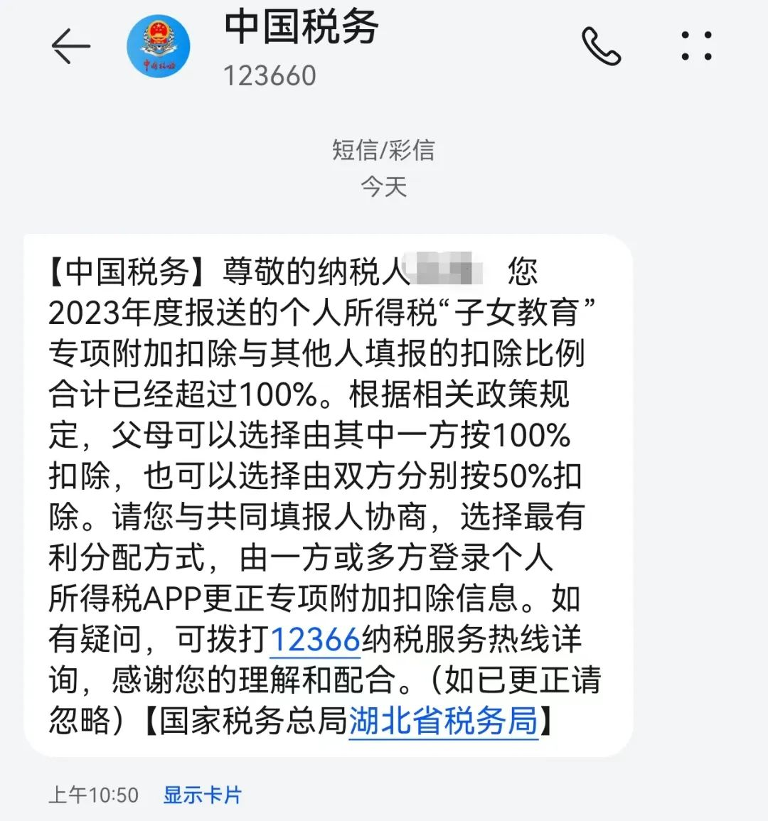 为什么会收到这个提醒? 税务机关对纳税人填报的专项附加扣除信息超比例数据进行比对后,发现有其他人员也填写了相应的扣除且合计扣除比例超过100%或超过最高限额,可能存在享受扣除有误的情况,故通过站内信或短信方式提醒纳税人自查。 2023年08月28日《国务院关于提高个人所得税有关专项附加扣除标准的通知》(国发〔2023〕13号)公布,2023年1月1日起,3岁以下婴幼儿照护专项附加扣除标准,由每个婴幼儿每月1000元提高到2000元。子女教育专项附加扣除标准,由每个子女每月1000元提高到2000元。赡养老人专项附加扣除标准,由每月2000元提高到3000元。 政策提示1 :子女教育和3岁以下婴幼儿,父母可以选择由其中一方按扣除标准的100%扣除,也可以选择由双方分别按扣除标准的50%扣除。 政策提示2 :赡养老人,独生子女按照每月2000元(2023年起为每月3000元)扣除,非独生子女由其与兄弟姐妹分摊每月2000元(2023年起为每月3000元)的扣除额度,每人分摊的额度不能超过每月1000元(2023年起为每月1500元)。 政策提示3 :大病医疗可以选择由本人或者其配偶扣除,未成年子女发生的医药费用支出可以选择由其父母一方扣除。 不按要求处理会有何法律后果? 1.填报专项附加扣除信息存在明显错误,经税务机关通知,拒不更正或者不说明情况的,税务机关可暂停纳税人享受专项附加扣除。 2.汇算未足额补缴税款的,税务机关将依法加收滞纳金,并在其个人所得税 《纳税记录》中予以标注,且影响以后年度汇算退税。 3.纳税人经税务机关通知申报而拒不申报或者进行虚假的纳税申报,不缴或者少缴应纳税款的,是偷税,由税务机关追缴其不缴或者少缴的税款、滞纳金,并处不缴或者少缴的税款百分之五十以上五倍以下的罚款。 那么,如何查看已填报的专项附加扣除信息?发现有误的又如何进行修改?请看以个人所得税APP为例的【操作指引】。