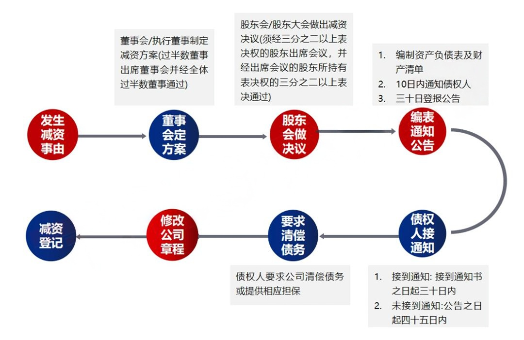 ③修改后的公司章程或章程修正案提交材料,审核通过,完成减资工商变更后,需要由委托代理人或法定代表人携带公司旧营业执照交至政务服务大厅,并到自助终端机打印新的营业执照。领取到新的营业执照后,减资流程正式完成,公司注册资本等信息将在工商行政管理部门予以更新。整个过程大概需要2个月左右。有减资需要的小伙伴要提前规划,避免工商拥挤排队,影响办理进度。答:不一样,二者虽然都是从被投资企业退回投资,但是撤资是一次性事项,撤资后不再保留股份,而减资只是减少股权份额,仍会保留部分股份。答:不一样,撤资是股东跟被投资企业的事情,股权转让是股东之间的事情。二是按照规定通知和公告债权人,否则退股股东有可能承担连带赔偿责任。程序相对复杂,需要编制资产负债表及财产清单,按照规定通知和公告债权人,与债权人协商债务偿还和提供担保等花费时间较长,因此适合股东配合且没有债务或债务很少的公司。