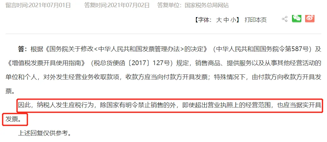 超出营业执照经营范围可以开票吗?国家税务总局正式回复!