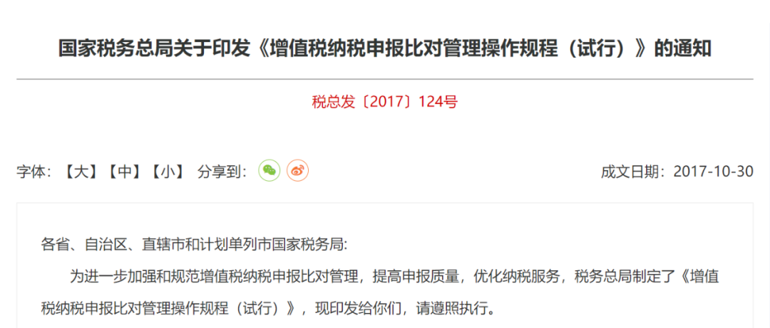 早在2017年,国家税务总局就颁布了《增值税纳税申报比对管理操作规程(试行)》。2.增值税一般纳税人和小规模纳税人开具的增值税发票信息;当期开具发票(不包含不征税发票)的金额、税额合计数应小于或者等于当期申报的销售额、税额合计数。纳税人当期申报免税销售额、即征即退销售额的,应当比对其增值税优惠备案信息,按规定不需要办理备案手续的除外。(1)当期已认证或确认的进项增值税专用发票上注明的金额、税额合计数应大于或者等于申报表中本期申报抵扣的专用发票进项金额、税额合计数。(2)经稽核比对相符的海关进口增值税专用缴款书上注明的税额合计数应大于或者等于申报表中本期申报抵扣的海关进口增值税专用缴款书的税额。(3)取得的代扣代缴税收缴款凭证上注明的增值税税额合计数应大于或者等于申报表中本期申报抵扣的代扣代缴税收缴款凭证的税额。(4)取得的《出口货物转内销证明》上注明的进项税额合计数应大于或者等于申报表中本期申报抵扣的外贸企业进项税额抵扣证明的税额。(5)按照政策规定,依据相关凭证注明的金额计算抵扣进项税额的,计算得出的进项税额应大于或者等于申报表中本期申报抵扣的相应凭证税额。(6)红字增值税专用发票信息表中注明的应作转出的进项税额应等于申报表中进项税额转出中的红字专用发票信息表注明的进项税额。当期申报的应纳税额减征额应小于或者等于当期符合政策规定的减征税额。申报表中的预缴税额本期发生额应小于或者等于实际已预缴的税款。(1)当期开具的增值税专用发票金额应小于或者等于申报表填报的增值税专用发票销售额。(2)当期开具的增值税普通发票金额应小于或者等于申报表填报的增值税普通发票销售额。(3)申报表中的预缴税额应小于或者等于实际已预缴的税款。(4)纳税人当期申报免税销售额的,应当比对其增值税优惠备案信息,按规定不需要办理备案手续的除外。纳税人当期申报的应纳税款应小于或者等于当期实际入库税款。注意!除了做好纳税比对外,财务如果离职,也要及时做好人员变更。