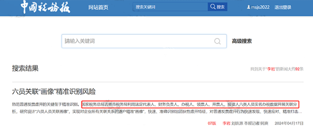 国家税务总局吉林市税务局利用法定代表人、财务负责人、办税人、领票人、开票人、投资人六类人员实名办税数据开展关联分析,研究设计“六员人员关联画像”,实现对企业所有关联关系的逐户精准“画像”,快速、准确识别出团伙性虚开特征,对普通发票虚开行为快速发现、快速应对、精准打击。吉林市税务局结合日常防范风险的实际情况,总结出普通发票虚开呈现六员高度关联、六员交叉任职等特征,其中多是长期从事涉税中介、熟悉税收政策的人员,利用税收优惠政策进行操作,具有更大的隐蔽性。因此,对虚开的团伙进行有效识别就成为关键一环。吉林市税务局利用实名办税数据库,对六员人员关联进行“画像”,开展全视角涉税风险分析,通过由自然人信息穿透到企业信息,实现从自然人行为透视企业行为,对企业的潜在涉税风险进行预判,前移风险识别分析环节。在小程序中输入企业的纳税人识别号,就可以生成该企业六员信息结构图,结构图内展现出企业六员人员关联的企业,以及关联企业相关联的其他六员人员,直至人员重复形成闭合回路。税务机关将结构图中闭合回路上关联重复率高的人员视为关键控制人进行深入分析,并列为重点监管对象,结合关联企业的注册地址、经营能力,从关联性、反常性、虚假性、隐蔽性四个重要方面精准识别和排查普通发票虚开风险。在发票管理方面,针对筛查出的重点纳税人进行风险管控。根据实际情况对这类纳税人发票额度进行授信额度调整,同时进一步扩大核查覆盖面,对其中涉及商贸、建筑安装、医药类企业,进行风险评估,根据生产经营实际情况进行发票额度调整。对赋票额度与上年开票月均额度相差较多的企业,做好日常风险管理,降低恶性虚开风险的同时,避免“一刀切”式降低额度,保障纳税人正常生产经营需要。在户籍管理方面,加大对登记注册地址的实地核查。重点对筛查出的虚假注册地址企业进行核查整治,对发现的虚假登记、登记不实、注册在居民楼且无实际经营能力的纳税人重点关注。落实定期巡查管理制度,定期对变更户、非正常户、走逃户的实际情况进行逐户比对检查。针对登记地址与实际经营地址不符等情况,及时通知纳税人根据经营状况进行变更登记,调整主管税务机关。