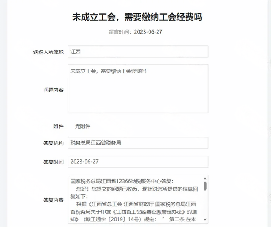 答复内容:根据《江西省总工会 江西省财政厅 国家税务总局江西省税务局关于印发<江西省工会经费征缴管理办法>的通知》(赣工通字〔2019〕14号)规定: