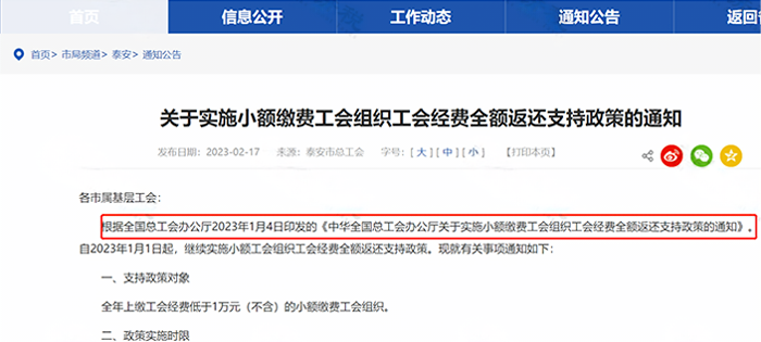 1、自 2023年1月1日起,继续实施小额缴费工会组织工会经费全额返还支持政策。