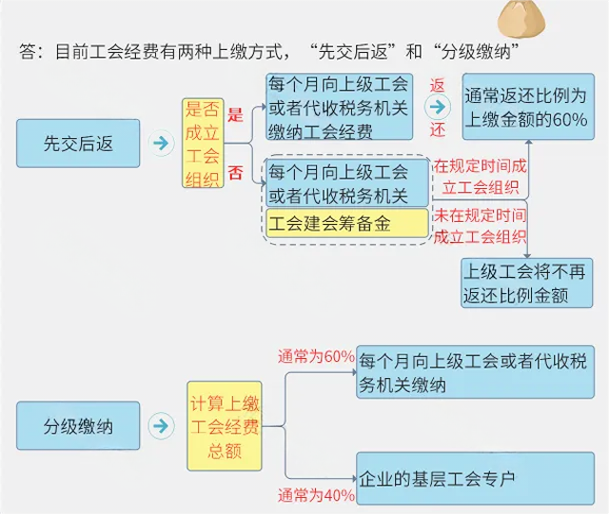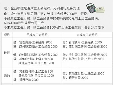 按每月全部职工工资薪金总额的2%计算出工会经费后,按当地规定比例「一般为40%」向受委托代收工会经费的税务机关缴纳。留成部分「一般为60%」由企业同时拨付给其所在的基层工会,未设立基层工会的,待建立工会组织后由各单位拨付本单位工会。工会经费拨付给工会后,工会单独设账核算。
