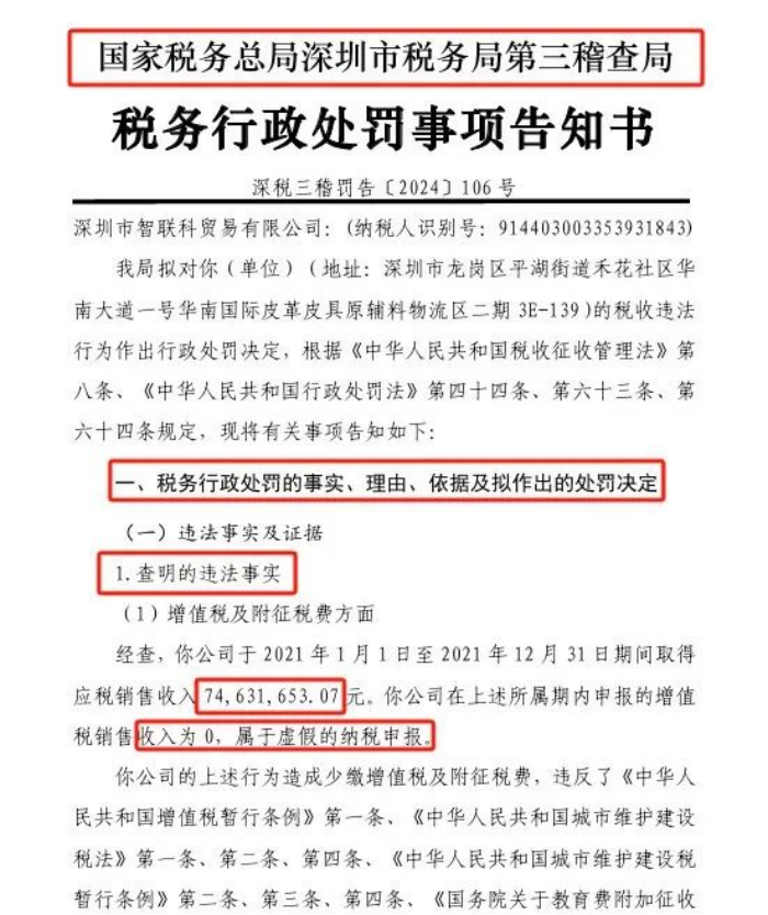 今年4月份,深圳一电商企业因年销售额7463万却长期0申报引起税务稽查。经过详细调查,税务局最终对该企业按0.5倍的罚款,补税及罚款共计338万元。