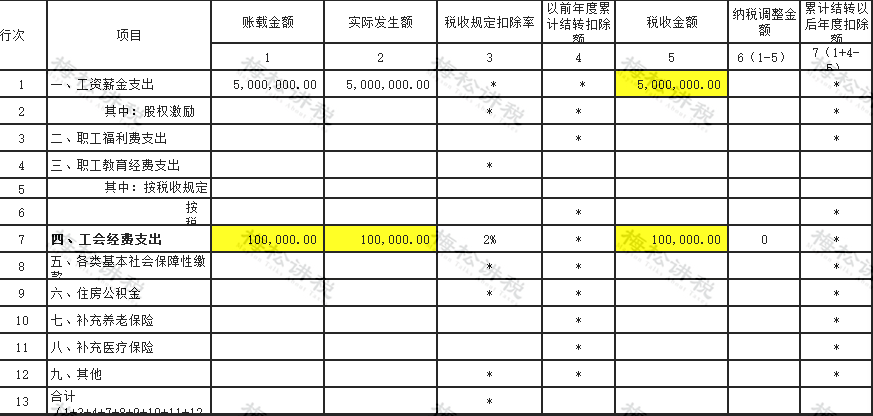 1、此处是实际拨缴的工会经费,如果只是计提的没有实际拨付,不允许税前扣除,需纳税调增。2、必须取得合法有效、有效的扣除凭证(工会经费收入专用收据、税局代收凭据),否则不能税前扣除,需纳税调增。公司2021年工资薪金总额500万,按2%计提并拨付了工会经费500*2%=10万,申报表填写如下,其他栏次省略。1、账载金额填报公司会计核算计入成本费用的工会经费支出金额10万;2、实际发生额分析填报纳税人“应付职工薪酬”会计科目下的工会经费本年实际发生额,公司10万全额拨付给工会,所以,这里的实际发生额应该填写10万。3、税收金额填报按照税收规定允许税前扣除的金额,按第1行第5列“工资薪金支出/税收金额”×2%与本行第1列、本行第2列三者孰小值填报,这三个数据都是10万,所以税收金额也是10万。4、纳税调整金额填报第1-5列的余额,这里不需要纳税调整。这几年国家陆续出台了很多支持小微企业、个体户的优惠政策!具体我们给你们准备了思维导图,方便大家学习~