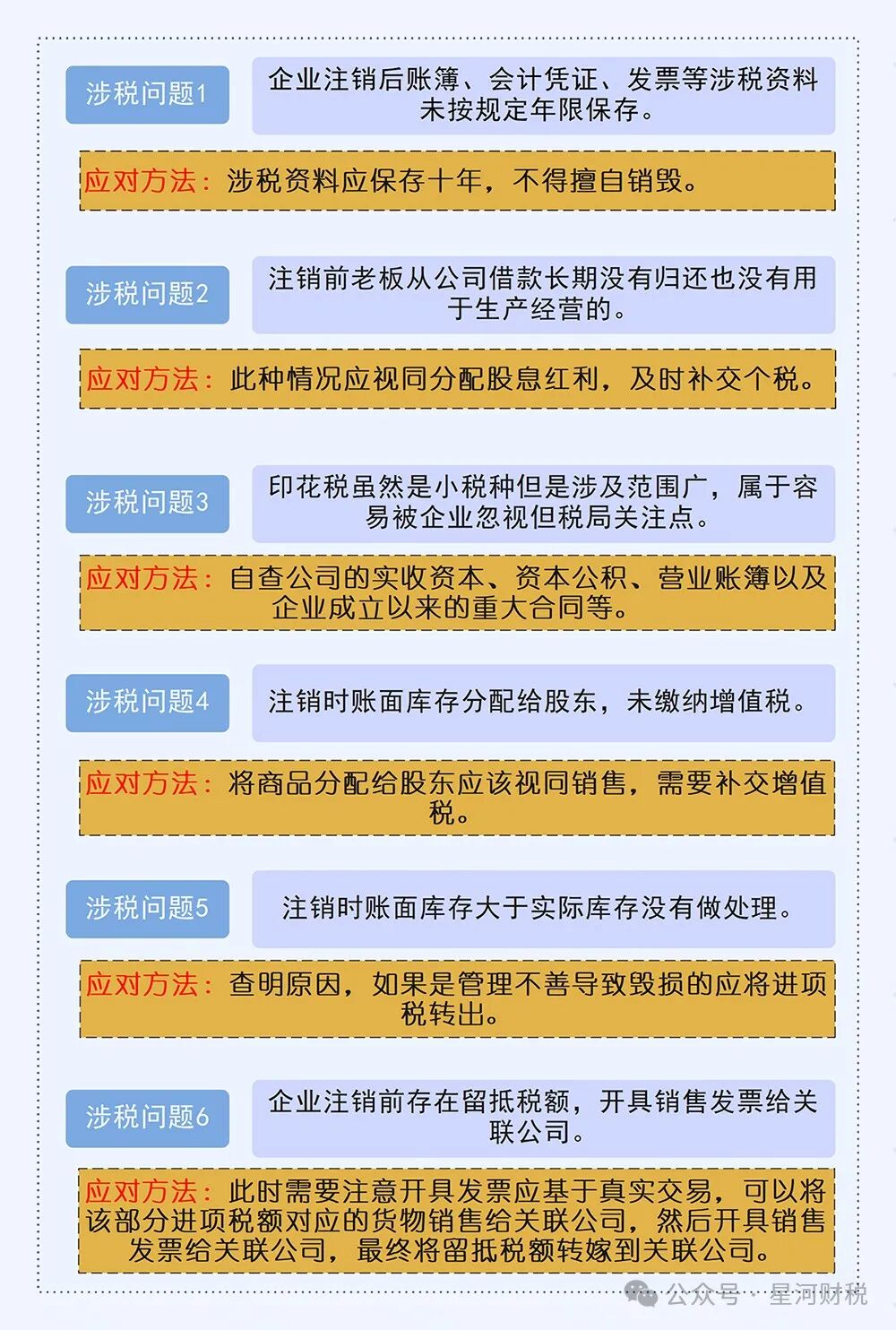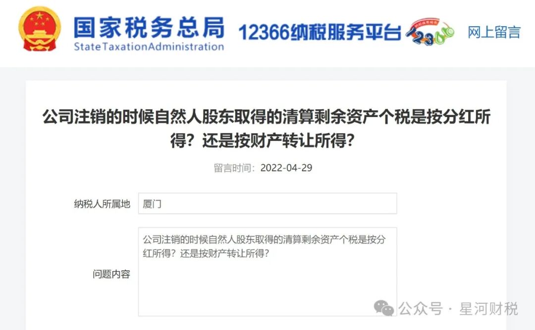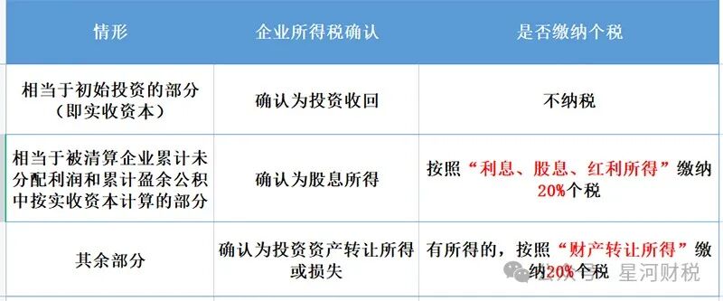 02 注销时,自然人股东分回的财产 按分红所得还是财产转让所得缴税? 公司注销的时候自然人股东取得的清算剩余资产个税是按分红所得?还是按财产转让所得? …… 被清算企业的股东分得的剩余资产的金额,其中相当于被清算企业累计未分配利润和累计盈余公积中按该股东所占股份比例计算的部分,应确认为股息所得;剩余资产减除股息所得后的余额,超过或低于股东投资成本的部分,应确认为股东的投资转让所得或损失。 03 公司注销6大涉税问题 提醒: 1、自然人持股的公司在注销清算时,若是账面上存在未分配利润、盈余公积等,按照自然人股东的股份比例来计算分红的20%的个税。 2、企业在注销清算时,不适用企业所得税的优惠税率。比如注销之前属于高新技术企业或者小型微利企业,清算所得不存在5%或者15%的优惠税率,一律适用25%的企业所得税。