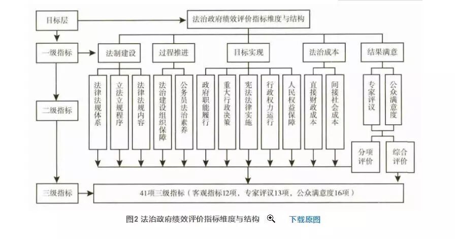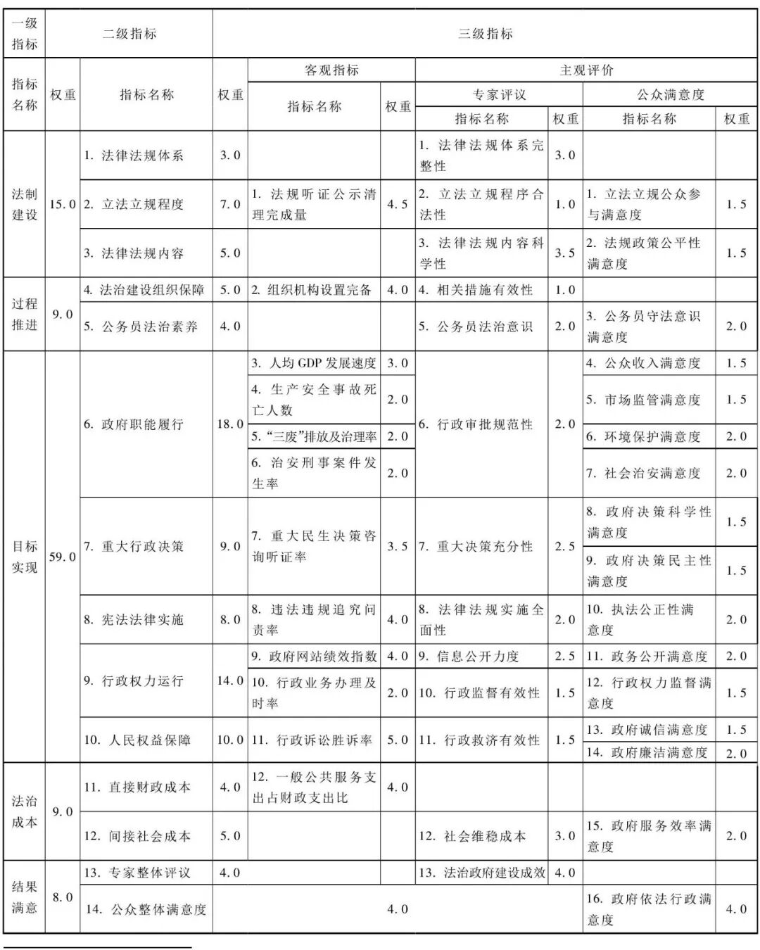 2015年12月,中共中央、国务院印发了《法治政府建设实施纲要(2015~2020年)》,把法治建设成效作为衡量各级领导班子和领导干部工作实绩的重要内容。事实上,自2002年党的十六大报告提出“依法治国是党领导人民治理国家的基本方略”之后,2004年,国务院发布《全面推进依法行政实施纲要》,提出用10年左右的时间基本实现建设法治政府目标。2012年,党的十八大进一步明确实现“依法治国基本方略全面落实,法治政府基本建成”的时间表。2014年,十八届四中会议将“依法治国”作为会议主题。同时,党和政府的这些重大决定(文件),都强调要充分发挥考评对法治政府建设的推动作用,确保法治政府建设目标得以实现。有组织就有管理与评价,“以评促建”符合管理的激励原理,也是我国党政组织管理的法宝。因为不管人们愿意不愿意,不管评估结果是否令人满意,管理活动的结果都必须能够进行恰当评估。同时,考评是手段不是目的,一切考评活动都服务于特定的目的。强化“法治政府建设考核评价,纳入政绩考核指标体系”的顶层要求涉及到法治政府、考核评价、政府绩效、指标体系等几个重要概念,以及作为组织管理手段的考评(工具理性)和作为民主理性的政府绩效评价的统一性,是全社会关注的重大课题。从我国组织考评的历史经验来看,“以评促建”的传统做法强调考评的工具属性及激励作用,它隐含着两个假设:一是激励目标本身的正确性和合法性;二是体制内部各项考评目标与功能的一致性。事实上,这两项假设只是一种理想情形,与政府内部的组织结构及现实环境存在距离,更何况在中国语境中,“法治”必须与党的领导和人民当家作主相结合,这是由中国的权力维度和秩序所决定的。(1)从技术的角度看,法治政府绩效评价面对为什么要评价、谁来评价、评价谁、评价什么以及如何评价等基本问题。学界普遍认为,一定程度上,评价主体决定评价的公信力,指标体系决定评价的科学性,但两者都服务于评价的目标定位。从我国目前的实际状况来看,法治政府建设考评作为组织管理手段意味着考评主体具有内置性(一般为上级党委政府,社会人士参与评议但非考评主体),因此,评价的目标定位及指标体系是问题的核心。贯彻全面依法治国战略,落实《法治政府建设实施纲要(2015~2020年)》,客观上要求面对现状,针对体制内部考评存在的各自为政、相互牵制、模糊目标、指标繁杂、流于形式等问题,围绕建设目标,基于政府绩效理念,构建目标导向明确、具有科学依据与广泛适应性的评价体系。狭义的法治与法治政府具有相同的内涵(2),核心在于规范和约束政府权力,以尊重和保障人权。简单而言,依法行政是法治政府的核心内涵,以确保行政主体、行政内容和行政程序的合法性;权从法出、权责法定是法治政府的根本要求;“透明廉洁、诚信负责和便民高效是法治政府的运行状态及具体表现形式”(3)。法治评价是对法治运行状况的测量与判断,或者说,运用相关指标对评价过程和结果的检验。(4)20世纪70年代后,有关法治评价理念开始将价值分析与规范分析相结合,强化主观指标的功能,某种程度上导入政府绩效评价的理念方法。但在西方的语境中,现代政府是法治的产物,法治政府为“常态”,法治评价虽然涉及到政府依法行政,但大多数情形下评价对象及范围指向整个国家或特定地区。因此,法治政府建设评价具有典型的中国特色,法治政府绩效评价更是全新的概念范畴。按照我们的理解,法治政府绩效评价是基于结果导向及公众满意度导向,依据既定的指标体系,对政府法治建设的投入、产出及效果进行综合性测量的活动,体现政府履行法治职能的经济性、效率性、有效性与公平性。在这里,政府法治与法治政府存在差异,前者为政府的主动职能,后者包含立法、司法与行政的关系,体现外部环境对政府的要求。不过,从技术层面,法治政府绩效评价可视为法治政府评价的延伸和拓展,即以政府绩效评价的理念方法对政府法定职能及实现职能法治化进行评价。我们以为,法治政府绩效评价与政府整体、政府部门、政府支出、政府政策绩效评价构成矩阵结构,评价体系所包含的组织体系(如评价主体、评价对象等)、技术体系(如评价周期、指标体系等)、制度机制等要素,与政府绩效评价相一致。法治政府绩效评价理论融合了法治政府理论与政府绩效评价理论。前者认为,法治政府是“最适合人的本性的政府”(5),人治政府是一种无限政府,法治政府凸现规则对权力的规范及有限政府属性。在法治的框架下,政府该干什么、不该干什么的边界由制度和法律来界定。法律具有至高无上性,对于政府来说,“法定职责必须为,法无授权不可为”。与法治国家、法治社会比较而言,法治政府强调国家行政权行使的法治化和依法办事、依法行政。(6)法治政府绩效评价的基本内容指向是政府依法律运行。政府绩效评价源自西方的公共管理运动,并成为政府管理创新的手段。但由于政府组织、行为及目标的特殊性与复杂性,过去半个多世纪以来,学术界对此存在着争论。菲利普·J·库珀将其定位于一种市场责任机制,包括经济学的效率假设、采取成本——收益的分析方式、按投入和产出的模式来确定绩效标准、以顾客满意为基础来定义市场责任机制等。(7)法治政府绩效评价首先指向政