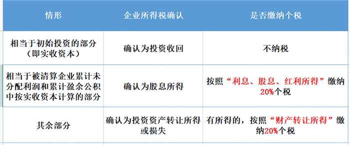 2、剩余资产减除股息所得后的余额,超过或低于股东投资成本的部分,应确认为股东的投资转让所得或损失,这部分所得应按照财产转让所得,缴纳20%个人所得税。