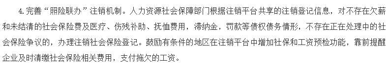 人力资源社会保障部门根据注销平台共享的注销登记信息,对不存在欠薪和未结清的社会保险费及医疗、伤残补助、抚恤费用,滞纳金,罚款等债权债务情形,不存在正在处理中的社会保险争议的,办理注销社会保险登记。