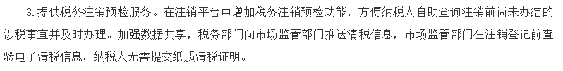 在注销平台中增加税务注销预检功能,方便纳税人自助查询注销前尚未办结的涉税事宜并及时办理。加强数据共享,税务部门向市场监管部门推送清税信息,市场监管部门在注销登记前查验电子清税信息,纳税人无需提交纸质清税证明。